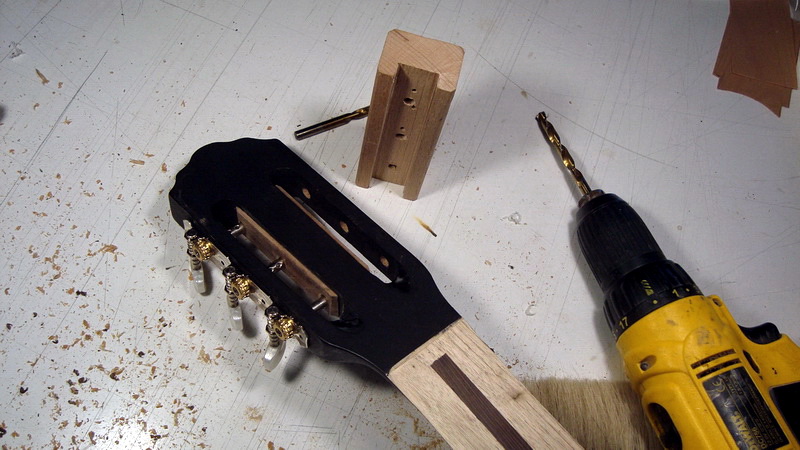 Στο λέω γιατί την πάτησα με την κιθάρα (πρώτη φορά έφτιαχνα τέτοιο headstock, είχε και ιδιαίτερα φαρδύ κεντρικό στέλεχος) και αναγκάστηκα να ανοίξω νέες τρύπες στα πάνω κλειδιά (γίνεται κι αυτό, αλλά αν μπορείς να το αποφύγεις...). Τσέκαρέ το με τα κλειδιά που θα χρησιμοποιήσεις τελικά.
