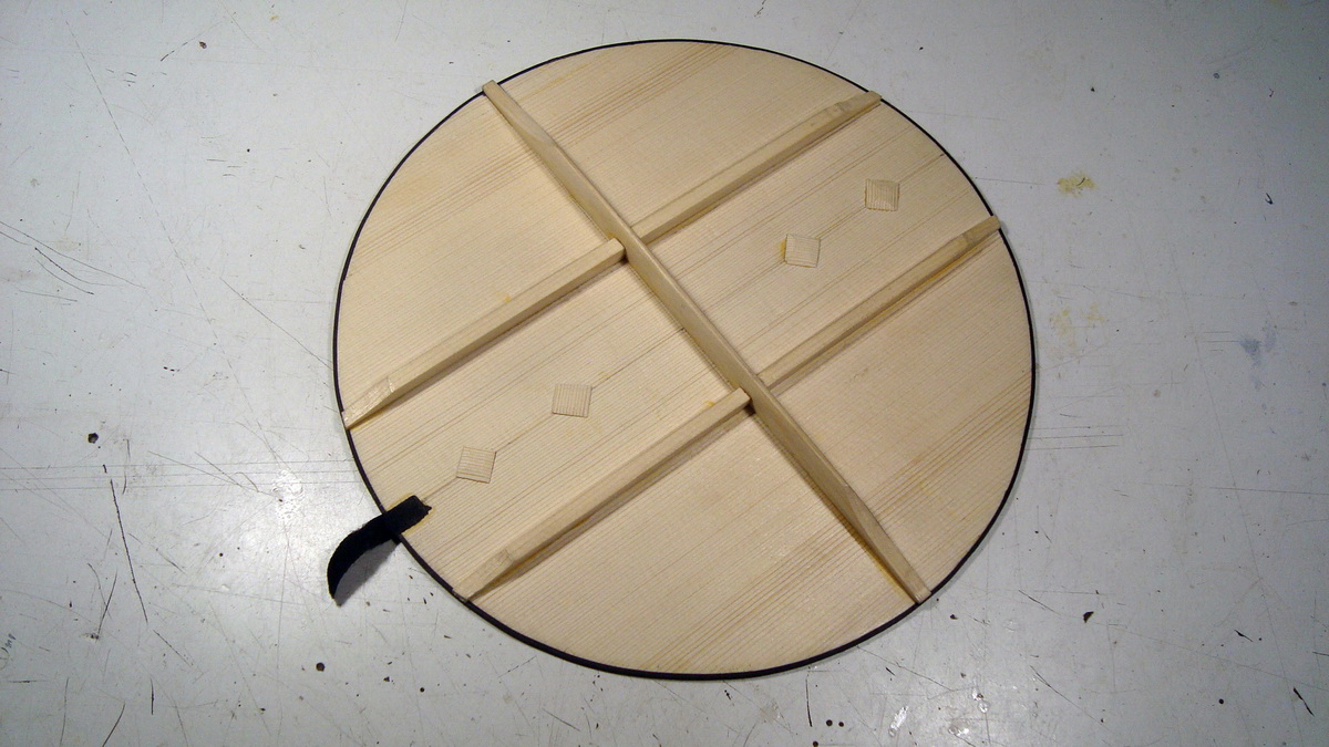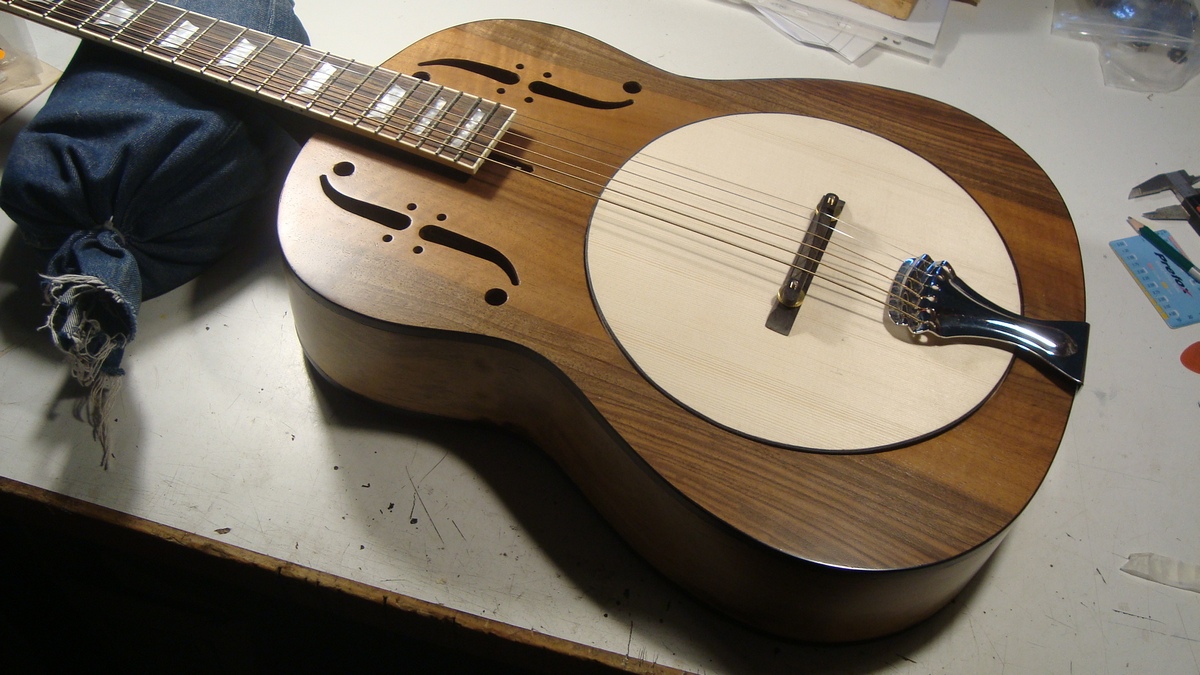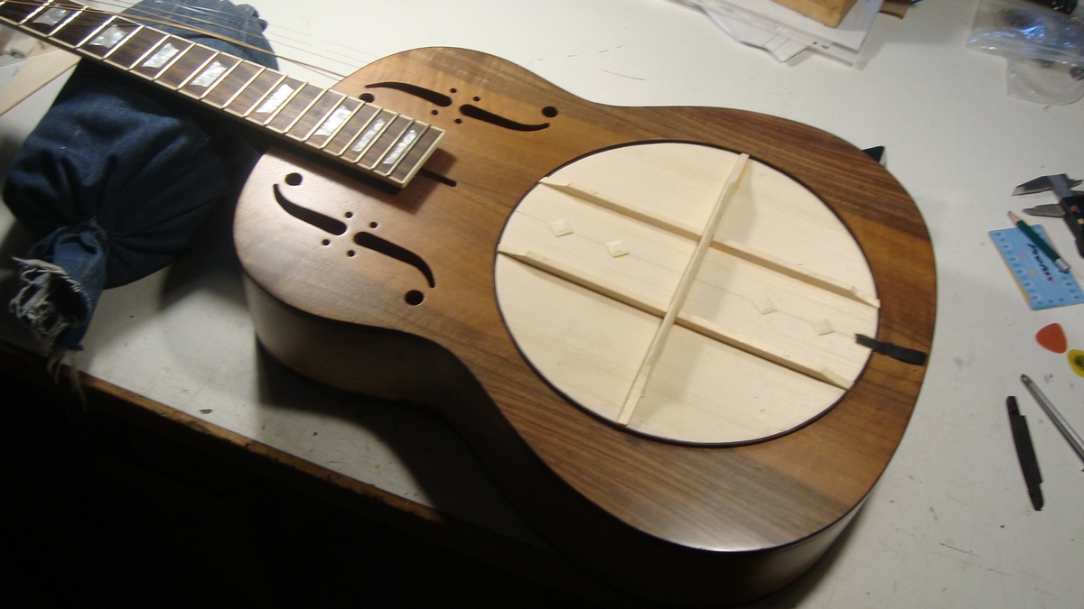 Το καπάκι έχει ένα μικρό radius (30 feet ~ 9,00 μ.)  Τα καμάρια φωλιάζουν στην περίμετρο της τρύπας, αλλά επειδή αυτό το project δεν το είχα επεξεργαστεί σωστά εγκαίρως οι φωλιές είναι ρηχές και η περίμετρος δεν πατάει με τον ίδιο τρόπο παντού, αφού ναι μεν τα καμάρια είναι διαμορφωμένα σε δίσκο αλλά δεν μοιράζονται σε ίσες αποστάσεις στην περίμετρο. Εν πάση περιπτώσει, αυτά είναι μάλλον "ψιλά γράμματα" και φαίνονται άμα ξέρεις που να κοιτάξεις. Ο καβαλάρης είναι εβένινος ρυθμιζόμενος για archtop - τον είχα πάρει από το ebay όταν ψαχνόμουν με τον καβαλάρη της πρώτης λαϊκής - και μου είχε μείνει. Χρειάστηκε γενναίο κατέβασμα (ήταν 2,5 εκ. Min) αλλά ταίριαξε τέλεια.
