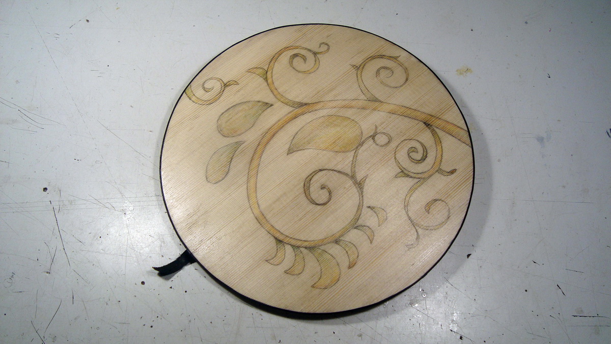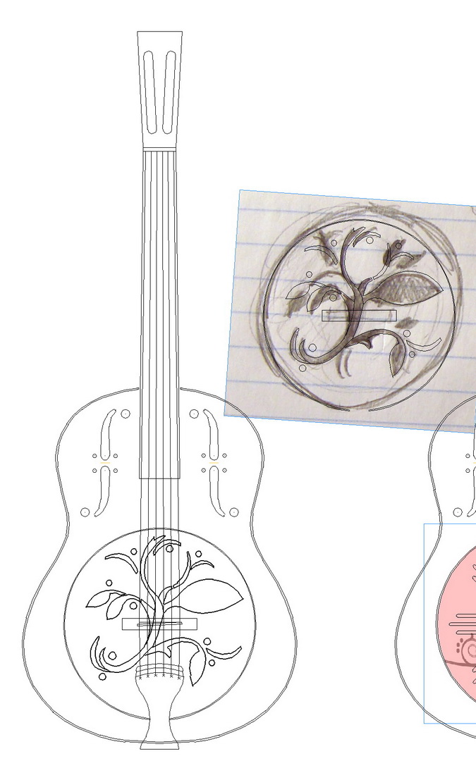 κατέληξα σ' αυτό το σχεδιάκι, το οποίο είναι καμωμένο με μολύβια και ξυλομπογιές. Πριν το κάνω, είχα περάσει το καπάκι με ελαφρύ sealer, μετά ένα χέρι κάσια που έβαψε κατά τόπους, μετά το ξανάξυσα κι έδειξε "παλιό" ή τουλάχιστον "αρκετά ταλαιπωρημένο" για να μην βγάζει μάτι σε σχέση με την υπόλοιπη κιθάρα.