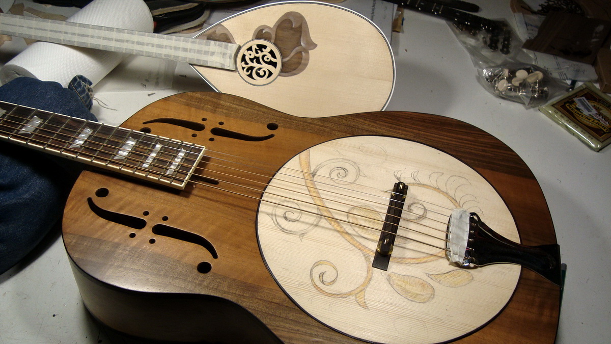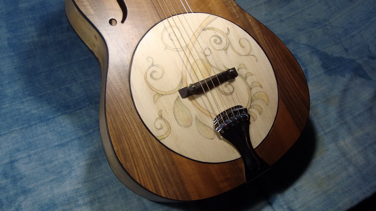Το άλλο που με ενοχλούσε κάπως ήταν η έντονη "καθαρότητα" και το σχεδόν λευκό χρώμα του έλατου σε σχέση με την κάπως "ταλαιπωρημένη" γενική εικόνα της κιθάρας (στο σκάφος έχω αφήσει τα σημάδια να φαίνονται). Έπρεπε να κάνω κάτι, κι αποφάσισα να "παλιώσω" λίγο το καπάκι κι επειδή αυτήν την εποχή με απασχολούν και τα ζωγραφισμένα όργανα, να ζωγραφίσω κάτι επάνω του.
