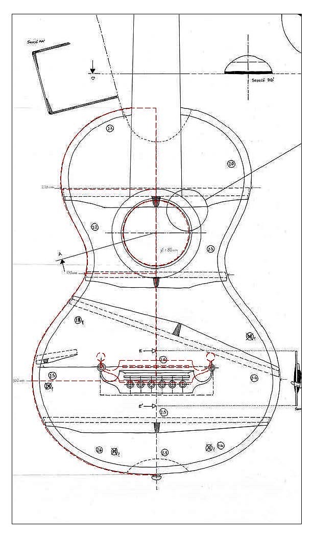 κάποιες διαστάσεις δίνονται στο σχέδιο, αν προσέξεις αριστερά στις καμπύλες πάνω / κατω καμπάνας και της μέσης υπάρχει ένα βελάκι αριστερά / δεξιά και ένας αριθμός, πιστεύω η διάσταση σε χιλιοστά. Η πάνω νομίζω ότι γράφει 250, αλλά η κάτω γράφει σίγουρα 300 και η μέση 170. Με βάση τις δύο τελευταίες η πάνω βγαίνει 230 (κι όχι 250, κάπως μοιάζουν το 3 με το 5, ίσως να είναι κακή εκτύπωση). Επίσης γράφει και την διάμετρο της τρύπας (80) που ταιριάζει με τις 300 και 170, οπότε υποθέτω ότι οι σωστές είναι 230-170-300 και η τρύπα 80 (με bold αυτές που χρησιμοποίησα για βάση). Με αυτές τις διαστάσεις, το μήκος του σκάφους βγαίνει 450, που είναι πιο λογικό για τέτοιο όργανο. Μήκος 50 εκ. είναι σύνηθες σε σκάφος κλασικής ή σύγχρονης ακουστικής, τα κιθαρόνια είναι πιο μικρά (γι αυτόν τον λόγο ξεκίνησα το ψάξιμο, έβαλα την εικόνα στο AutoCad και την έφερα σε κλίμακα σύμφωνα με τις παραπάνω διαστάσεις).