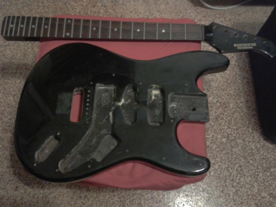Πρόκειται για μια φτηνή ηλεκτρική κιθάρα τύπου Strat (την πρώτη μου) που μετά από 10 περίπου χρόνια καταξιωμένης πορείας στην διακόσμηση του τοίχου του σπιτιού είπα να την κάνω μάχιμη!