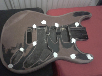 Όσον αφορά το μπράτσο είναι και αυτό βαμμένο (από “μαμά”) μαύρο gloss. Θέλω και εδώ να κάνω Swirl αλλά ΜΟΝΟ στο headstock (δεν ρισκάρω να γίνει κουλούρι η ταστιέρα). Έτσι για το μπράτσο (εκτός headstock) σκέφτομαι ένα “απαλό” τριψιματάκι, ίσως κάποια στοκαρίσματα σε κάποια χτυπήματα (πολύ μικρά), τοπικό βάψιμο σε αυτά και τέλος tru oil.