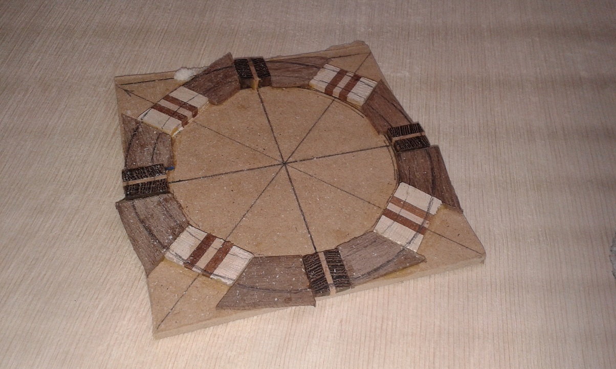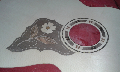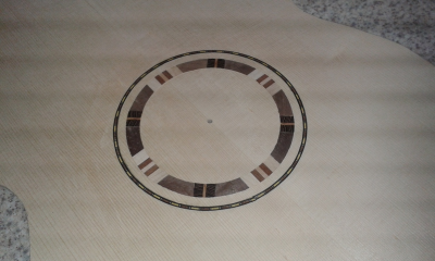 Η ροζέτα και η περιφερειακή διακόσμηση με τα γραμμικά ακτινωτά τοποθετημένα ξυλάκια , είναι από το ίδιο σόϊ .