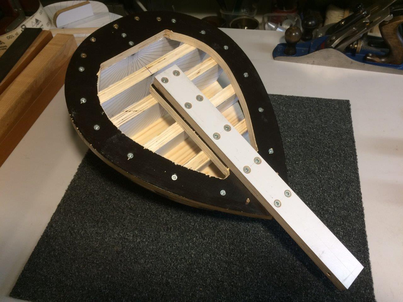 Έκοψα τη βάση με τρόπο που εκτιμώ ότι βολεύει το κόλλημα κολλάντζας και πλαιναριών. Πέρασα και δυό χέρια βερνίκι ελπίζοντας σε καλύτερο ξεκόλλημα μετά την κατασκευή. Έβαλα και ένα κομμάτι από κάτω για να το πιάνω στη μέγγενη.