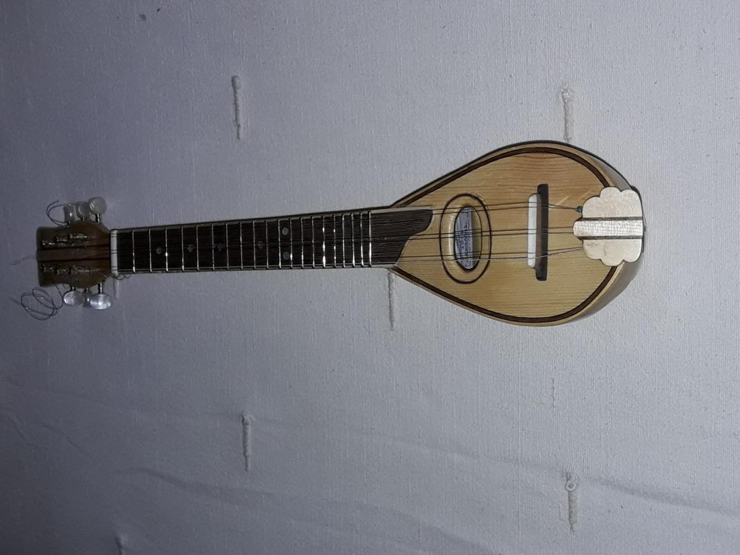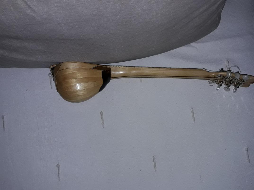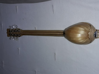 Σκαφος κελεμπέκι, καπάκι έλατο, μάνικο κελεμπέκι φλαμούρι και κάποιο μάλλον αφρικάνικο ξύλο (νιαγκον??? Δεν έχω ιδέα) Καράολο και διακοσμητικό χορδιέρα ίδιος συνδυασμός ξύλα με το μάνικο. Το σκάφος είναι με ντούγιες σκαφτές. Η όλη διακόσμηση κινείται στα χρώματα  του καφέ από το αφρικάνικο ξύλο και του λευκού. Το μοναδικό που κάπως διαφέρει είναι η ΄΄γραβάτα’’ από μακασάρ. Ο καβαλάρης κόκκαλο και έβενος αλλά για αισθητικούς καθαρά λόγους επιλέχθηκε να είναι δίχρωμο το ξύλο.