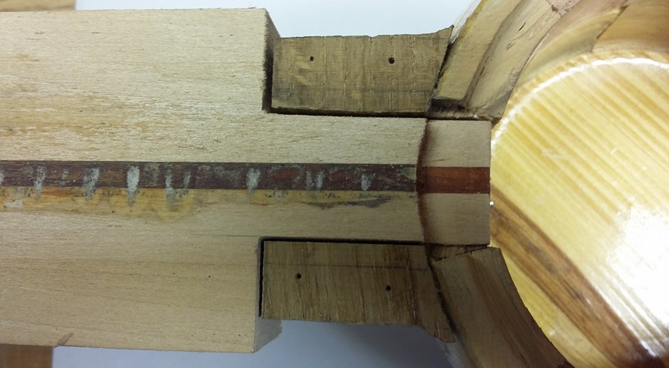 η σφήνα (κατακόρυφη) στο αρσενικό μόρσο, η φωτογραφία μέσα από το σκάφος (επισκευή Φρονιμόπουλου σε μπουζούκι Σταθόπουλου, η σφήνα είναι από την αρχική κατασκευή)