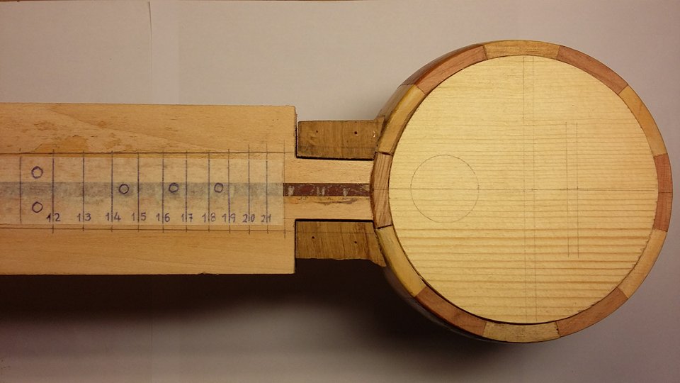 Στη μέση , αντέγραψα πιο σωστά το κεφάλι του παπαγάλου, απομάκρυνα λίγο τις θέσεις των κλειδιών , μέτρησα όσο πιο προσεκτικά μπορούσα σύμφωνα με την επιθυμητή κλίμακα (38 εκ.) , τη θέση του nut , το πάχος του καράολα, το πάχος του μάνικου, κλίση 10 μοίρες ...