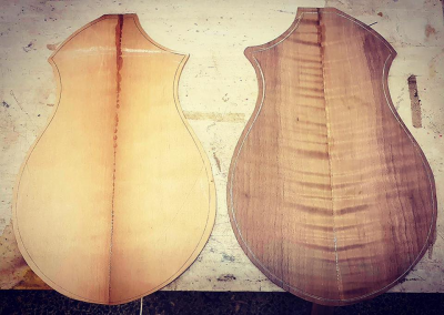 Χρησιμοποιηθηκαν 45 χρονων sitka spruce για το καπακι και West coast claro walnut για την πλατη και τα πλαινα