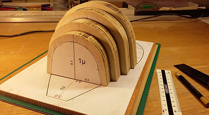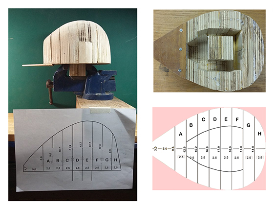 Σύμφωνα με τα παραπάνω, σχεδιάστηκαν τα "πατρόν" , κολλήθηκαν σε κοντρα πλακέ πάχους 2,5 εκ. , και κόπηκαν όλοι οι νομείς για το καλούπι.