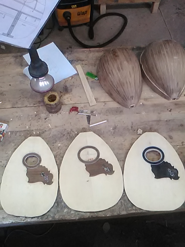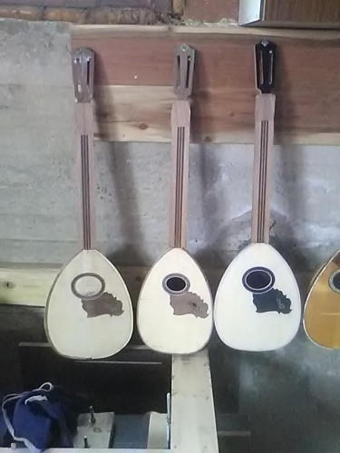 Καλησπέρα σε όλους!! Εχοντας άπειρο ελεύθερο χρόνο το καλοκαίρι που μας πέρασε ξεκίνησα την κατασκευή τριών οργάνων. Αυτή την περίοδο βρίσκομαι στην διαδικασία του βερνικώματος. Τα τρίχορδα έχουν ελε'υθερο μήκος χορδής 68 και το τετράχορδο 67. Τα σκάφη τους είναι από καρυδια τα μανικια ιρόκο (νομίζω) με κόντρες από βεγγε τα καπάκια έλατο και οι ταστιέρες από έβενο. Στο ένα τρίχορδο ήθελα να δοκιμάσω κάτι διαφορετικό για το καπάκι που τελικά δεν ξέρω αν θα πετύχει η όχι.