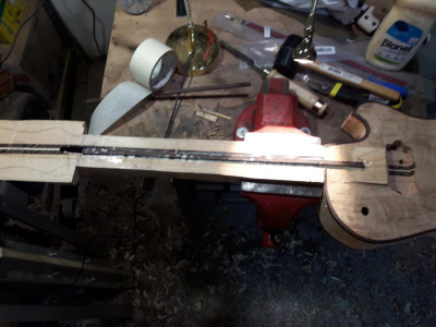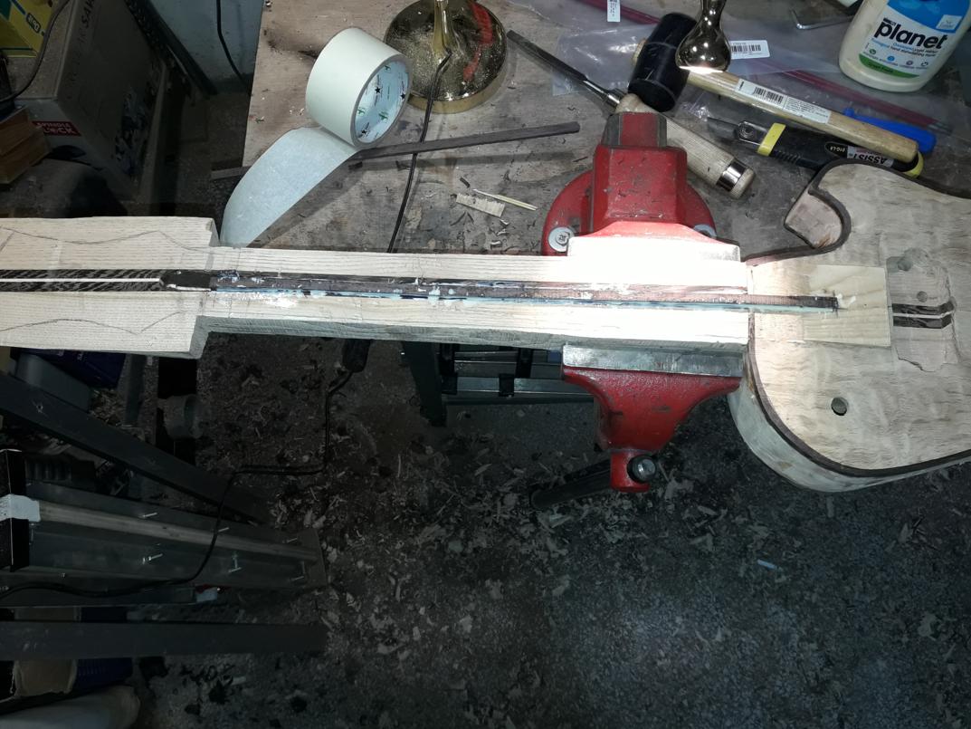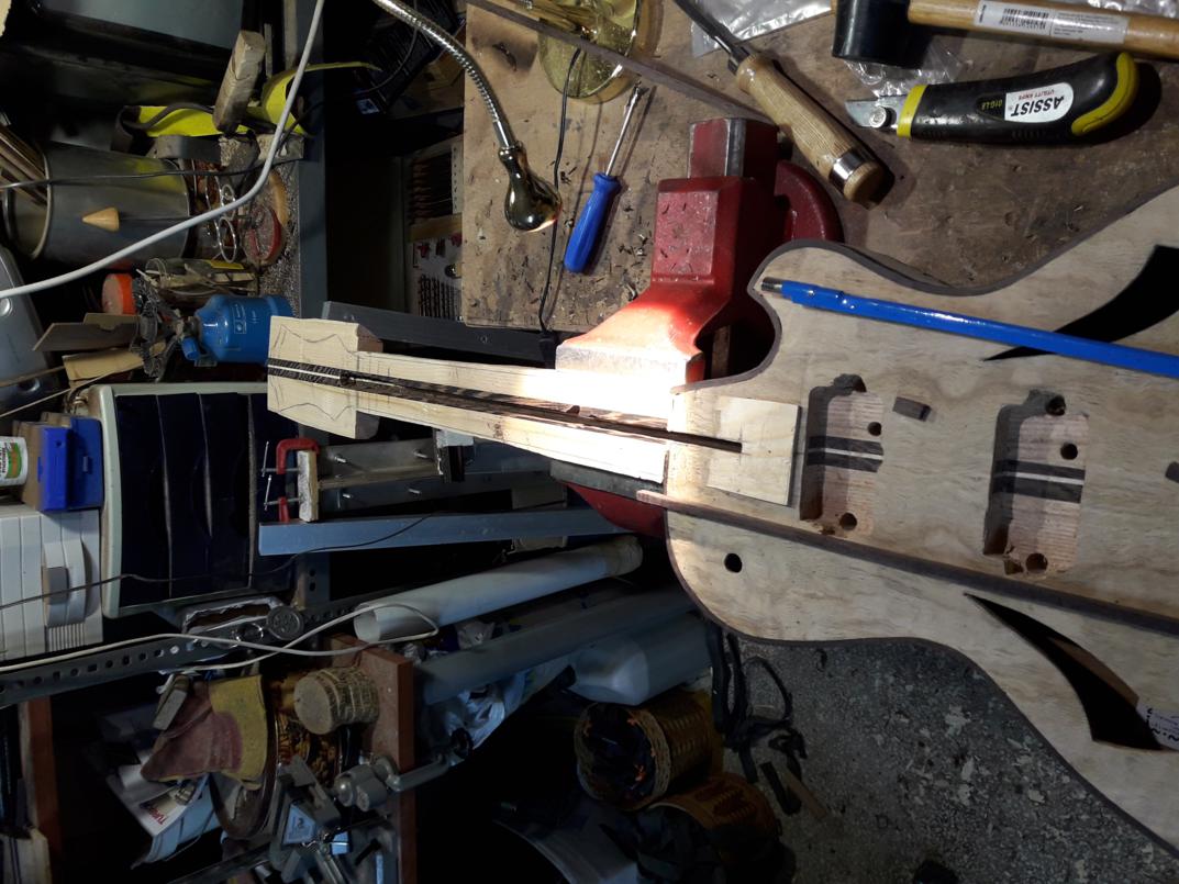 Μαζί με τα όλα τρεξίματα προχωράει και η ηλεκτρική αργά- αργά. Με μάλωσε και ο φίλος μου ο Στέλιος ότι δεν πιάνω σκαρπέλα και είπα χτες το βράδυ να δουλέψω την κιθάρα. Γίνανε κλειδιέρα και τρύπες για τα κλειδιά. (Το μάνικο είναι μονοκόμματο αλλά μπήκε σάντουιτς πάνω κάτω με το ίδιο ξύλο του σκάφους. Με ράσπες λίμες μορφοποποίησα το μάνικο και την κλειδιέρα. Τάστα και τσαμπουκάδες είχα βάλει πιο πριν. Καθώς και βέργα. Στο κανάλι έκανα μια πατάτα και μου έφυγε το ρούτερ λίγο σε έν α σημείο (στη φωτογραφία φαίνεται κάπως καθώς και το ξυλαράκι που έβαλα για να κλείσω το κενό). Π΄νω από την βέργα μπήκε κομμάτι παλίσνδρος. Για την επίτευξη κλίσης μπήκε σφήνα από έλατο ανάμεσα την ταστιέρα και το καπάκι (το αναφέρω γιατί πρόσφατα υπήρχαν ερωτήσεις για την κλίση και μπορεί να γίνει).