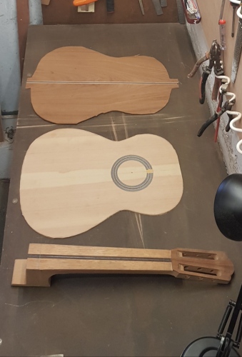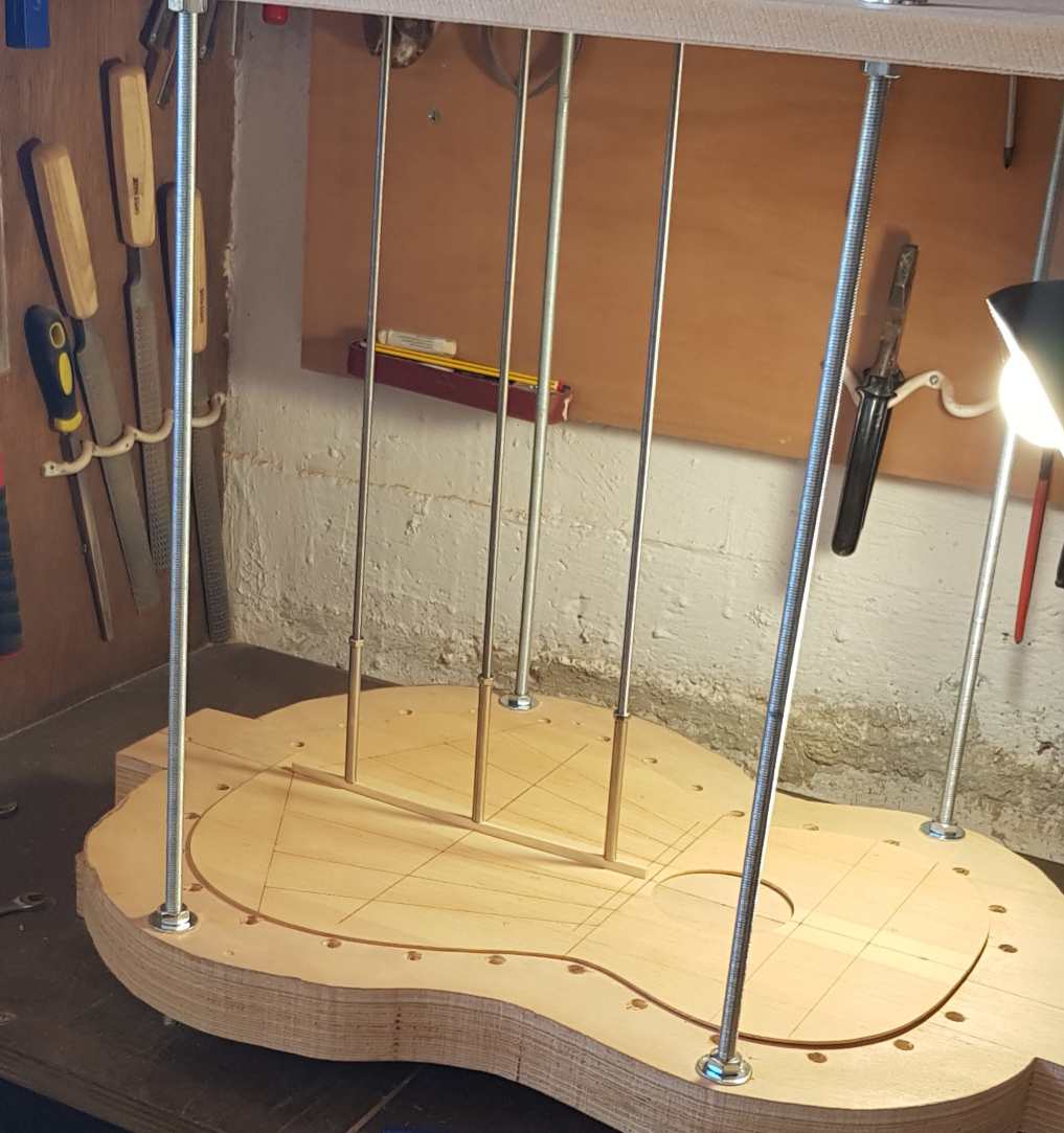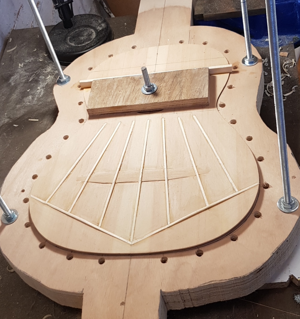 Η σκεψη ειναι πολυ απλη. Φτιαχνεις ενα καλουπι της μισης κιθαρας με τις ιδιες καμπλυλες απο δυο κοντραπλακε κομματια. Τα ενωνεις με ντιζες , ξυλα ο,τι θες ωστε να εχουν μια αποσταση μεταξυ τους 15 ποντους ωστε να πιανει ολο το πλατος τους πλαινου που συνηθως ειναι 12-13cm ( ο Παλαιοδημοπουλος εχει ενα μεγαλο και λυγιζει και τα δυο πλαινα ταυτοχρονα) και το σκεπαζεις με ενα μεταλλικο φυλλο, Inox ή αλουμινιο ωστε να καπακωθει. Μετα φτιαχνεις την πρεσα που στην ουσια ειναι μια βαση που θα βαλεις επανω τρεις λαμπες που θα την καπακωνεις με το καλουπι της κιθαρας και θα ζεσταινουν την μεταλλικη του επιφανεια. Στο κεντρικο μερος θελεις εναν τακο που θα εχει την καμπυλη του μεσαιου μπουτ και με μια ντιζα-βολαν θα το κατεβαζεις προς τα κατω αργα για να καμπυλωνει το κεντρικο μερος . τα Αλλα δυο μπουτ εγω μετα τα καμπυλωνα με κομματια ξυλου πιασμενα με ελατηρια αριστερα και δεξια στο σωμα της πρεσας.