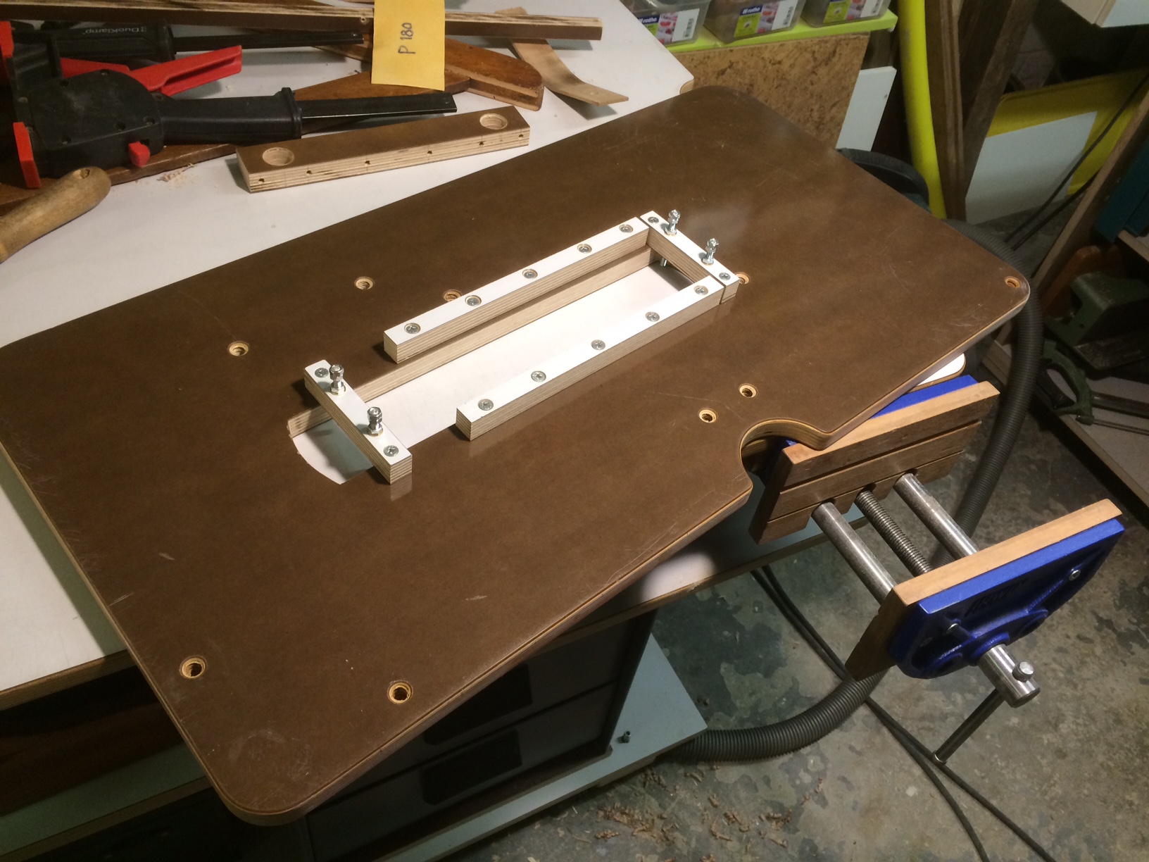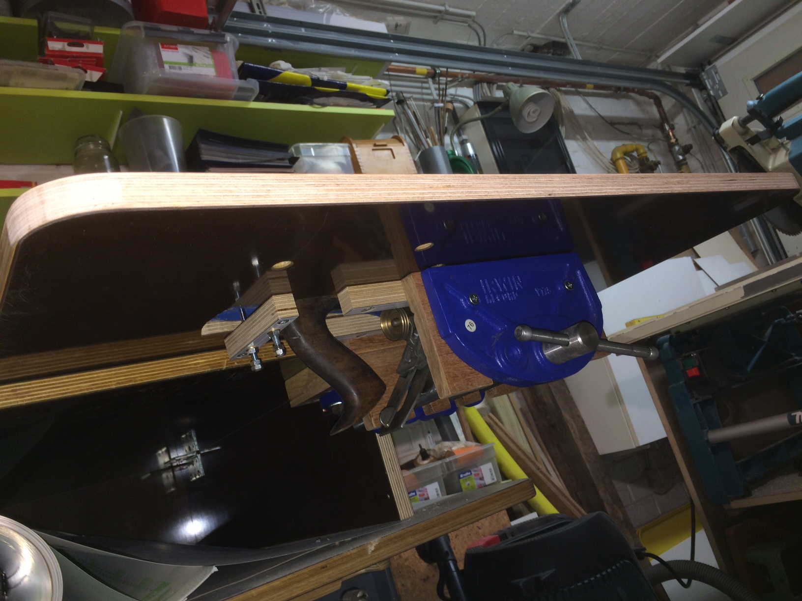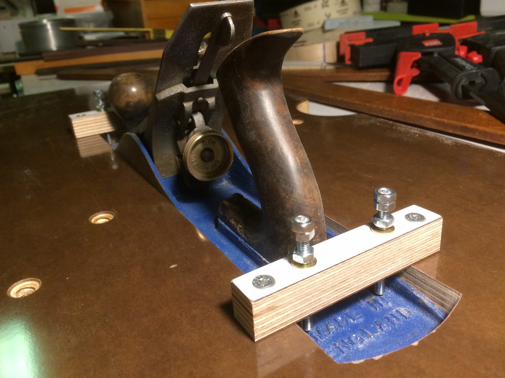 Καθώς ξέρω ότι σχεδόν όλα τα εργαστήρια πάσχουν από έλλειψη χώρου, κατασκεύασα ένα "τραπέζι" που φιλοξενεί μια πλάνη χειρός με κύρια έγνοια την οικονομία διαστάσεων. Έχει λοιπόν πιο πολύ τη μορφή τάβλας αντί να είναι ένα κουτί. Στερεώνεται δαγκώνοντάς τη από κάτω με μια μέγγενη μαραγκού και όταν δεν χρησιμοποιείται αποθηκεύεται σχετικά εύκολα.