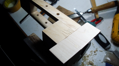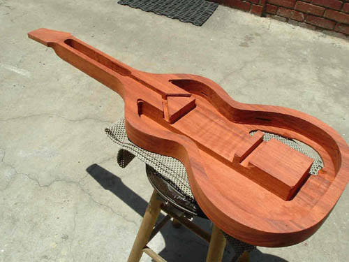 το headstock (από Μέλιο νομίζω μου είπε ο Σοφιανός, τόσο σκληρό είναι ? πρώτη φορά το δουλεύω και μου έκανε εντύπωση) και ο πίσω τάκος από πεύκο. Αυτόν μπορεί να τον καλύψω με καπλαμά, δεν έχω αποφασίσει ακόμα. Επίσης δεν έχω αποφασίσει αν τα πλαϊνά απλώς θα ακουμπάνε επάνω του ή θα τα "χωνέψω" στα πλάγια.