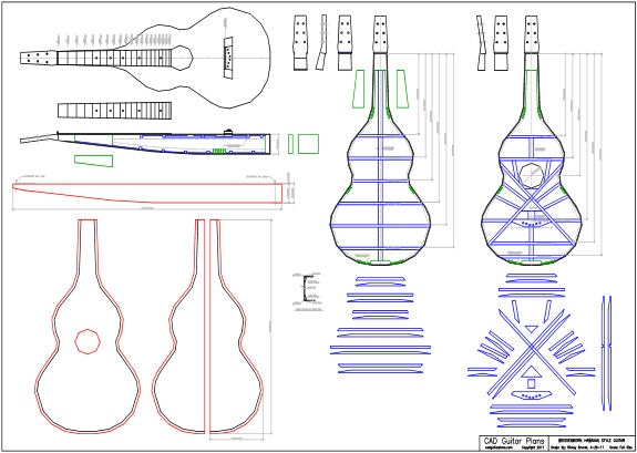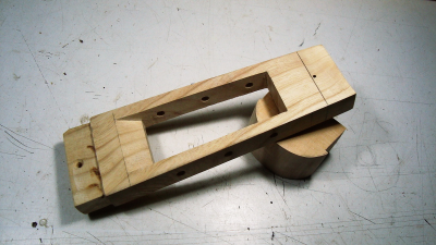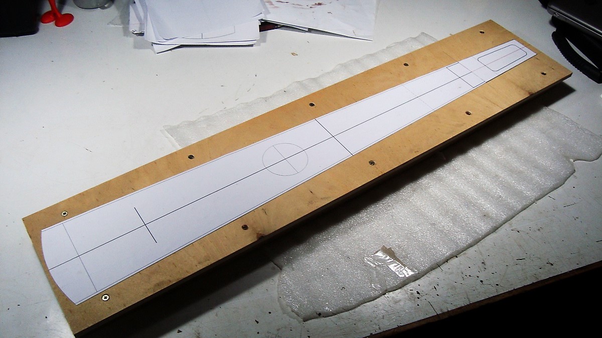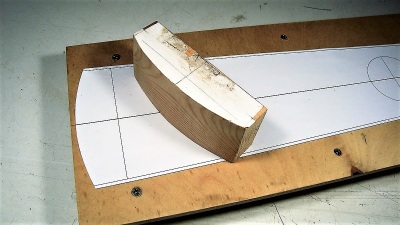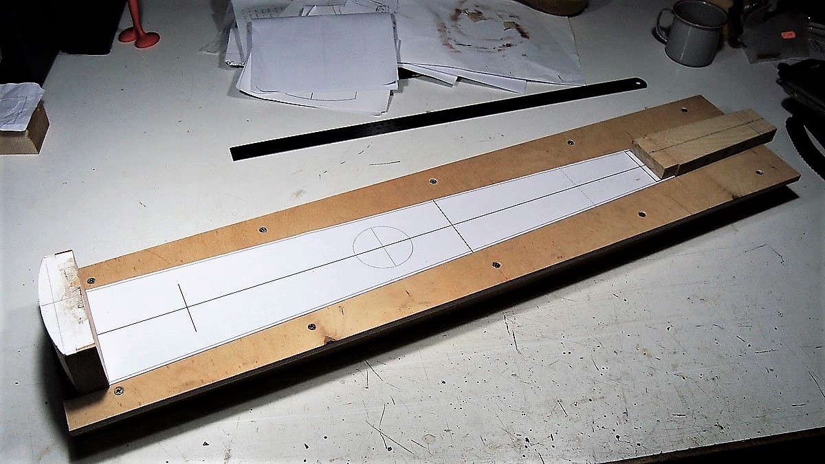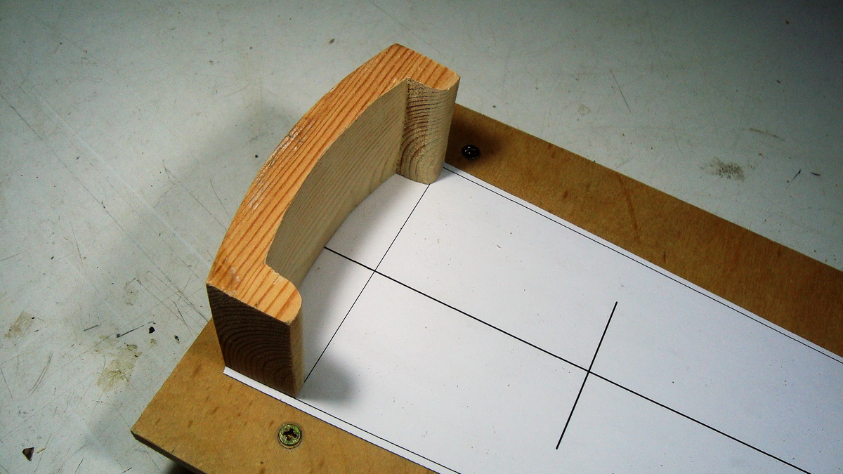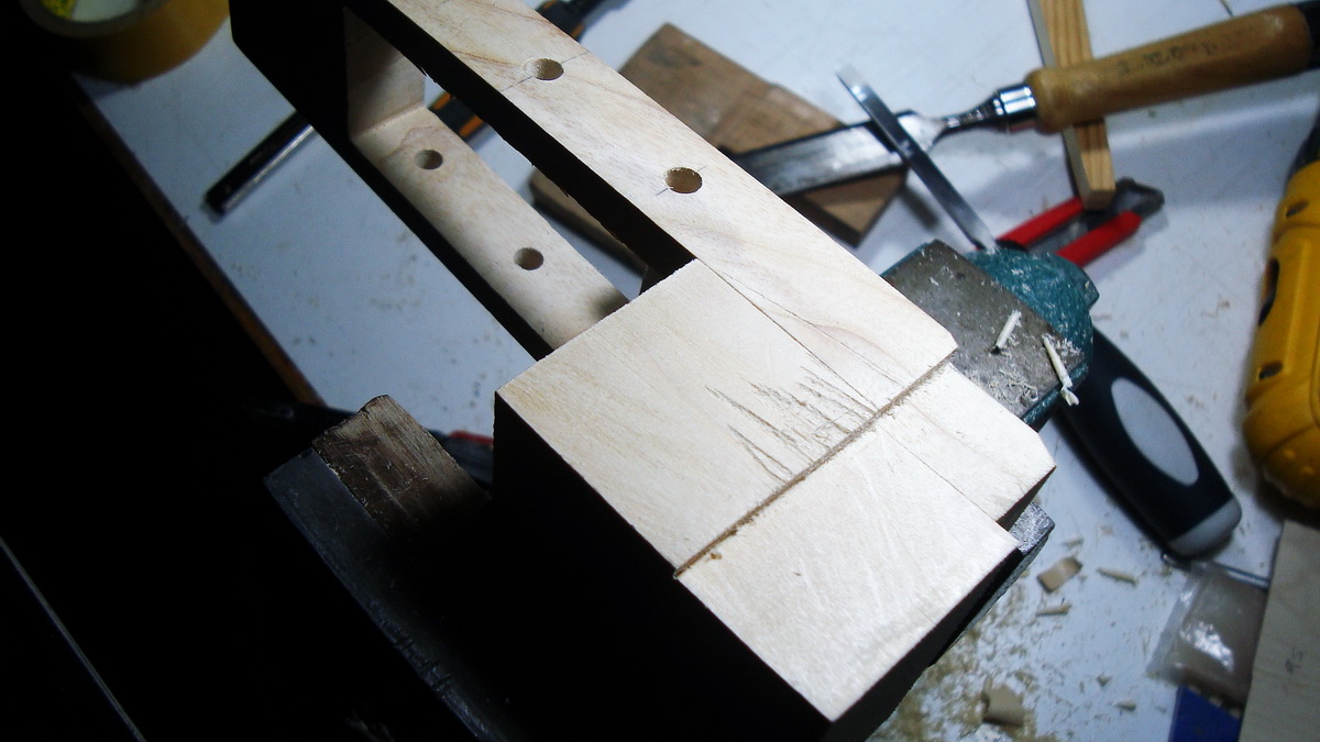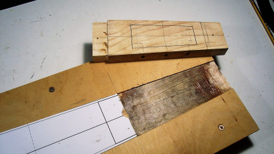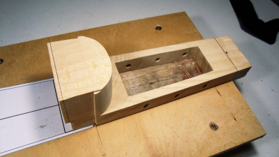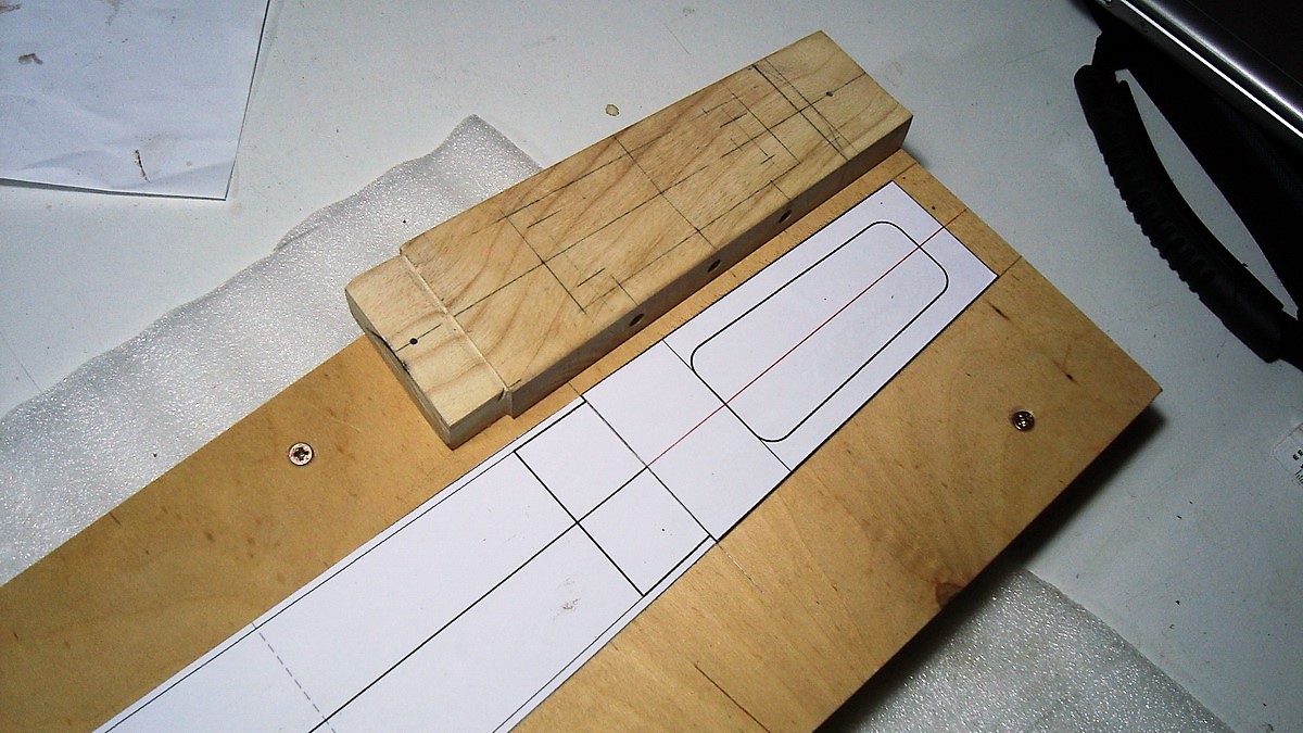 Διαμόρφωσα μια ανισοσταθμία με ίδιο ύψος (όσο το πάχος του καπακιού) και στο headstock και στην βάση, ώστε οταν "ξεκαλουπώσω" το όργανο αφού κολληθούν πλαϊνά και τάκοι, το headstock να περισσεύει (όσο το καπάκι) από το χείλος του σκάφους. Η χάραξη της βάσης έγινε με τέλεια εφαρμογή στις γωνίες του headstock, και λόγω του τραπεζοειδούς του σχήματος δεν μπορεί να γλιστρήσει στην κόλληση. Ο κάτω τάκος θα βιδωθεί (από κάτω από την βάση) για να μείνει σταθερός και μετά θα ξεβιδωθεί.