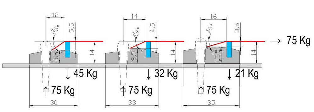 Εγώ θεωρώ ότι (όπως ο αρχικός τύπος υπολογίζει την κάθετη δύναμη) το αποτέλεσμα που παίρνω αφορά την πίεση του κόκκαλου στο βάθος της σχισμής όπου στερεώνεται - και από εκεί στο καπάκι. Ο φίλος μηχανικός μου είπε ότι η γραμμική δύναμη της χορδής (σαν συρματόσχοινο) μεταφέρεται αυτούσια στο άλλο άκρο ακόμα και υπό γωνία : δηλαδή η δύναμη με την οποία οι χορδές τραβάνε προς τα πάνω το καπάκι (στην περίπτωση καβαλάρη με pins) είναι όσο και οι τάσεις τους (στην περίπτωση αυτή 75 kg).  Αυτά τα ζωγράφισα με βελάκια στο σχέδιο παραπάνω.