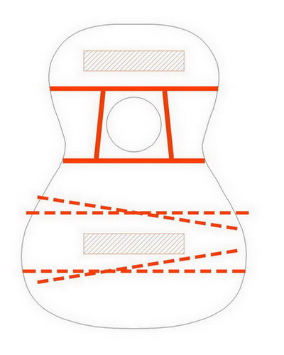 Ιωσήφ, προς τα εκεί τείνω κι εγώ για τα καμάρια.. το X bracing μου φαίνεται πολύ "σφιχτό".. αυτός είναι στην ουσία ο προβληματισμός μου, η ισορροπία μεταξύ ικανοποιητικής στήριξης και ανταπόκρισης του καπακιού.. αυτό που με μπερδεύει πολύ είναι το σχήμα του καπακιού που - αντίθετα με την κιθάρα αλλά και το μπουζούκι - δεν έχει περιοχή κάτω από τον καβαλάρη. Επίσης όπως έγραψα, τι ρόλο ακριβώς παίζουν τα διαμήκη (μακριά) καμάρια.