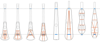 Εδώ τα μεγέθη είναι προσαρμοσμένα στην κλίμακα της lap steel (60 εκ.) που είναι ίδια με της backpacker. Τα dulcimer έχουν διάφορες κλίμακες (συνήθως μεγαλύτερες) και τα "κατέβασα" για να υπάρχει σύγκριση.