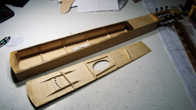 παίζοντας ανακαλύψαμε κι άλλο πρόβλημα: η break angle έγινε επίτηδες σχετικά μικρή για να μειώσω την φόρτιση στο καπάκι (με 7° έχει 13,5 κιλά. εννιά μπουκάλια νερό δηλαδή σηκώνει το καπάκι σε επιφάνεια όσο ο καβαλάρης). Λόγω συνδυασμού της συγκεκριμένης break angle και του τρόπου παιξίματος με πένες στα δάχτυλα (finger picks - που "τραβάνε" και γενικά ταλαιπωρούν τις χορδές), αυτές πηδάγανε το κόκκαλο και υπήρχε πρόβλημα.