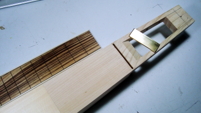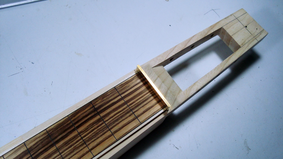 Nut από ορείχαλκο. Δεν ξέρω ακριβώς τον λόγο (sustain ?), πάντως είναι συχνή επιλογή και είπα να δοκιμάσω. Μπορεί βέβαια να γίνει κι αυτό από κόκκαλο.
