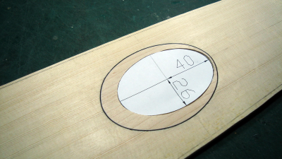 και το δεύτερο θέμα - ίσως όχι τόσο δεσμευτικό - είναι η επιφάνεια της τρύπας. Λαμβάνοντας υπόψη τον Helmholtz και με επιφάνεια οπής 3216 μμ³ στο  στο αρχικό σχέδιο , τα f holes μετά βίας βγάζουν το μισό. Στο αρχικό σχέδιο είναι η κυκλική οπή, θεωρητικά ο αέρας του σκάφους με επιφάνεια οπής 3216 συντονίζει σε περίπου F# / G. Θυμίζω ότι τα ανοιχτά κουρδίσματα που χρησιμοποιούν είναι D και G, αυτό το κούρδισμα του αέρα μου φαίνεται ... ταμάμ!