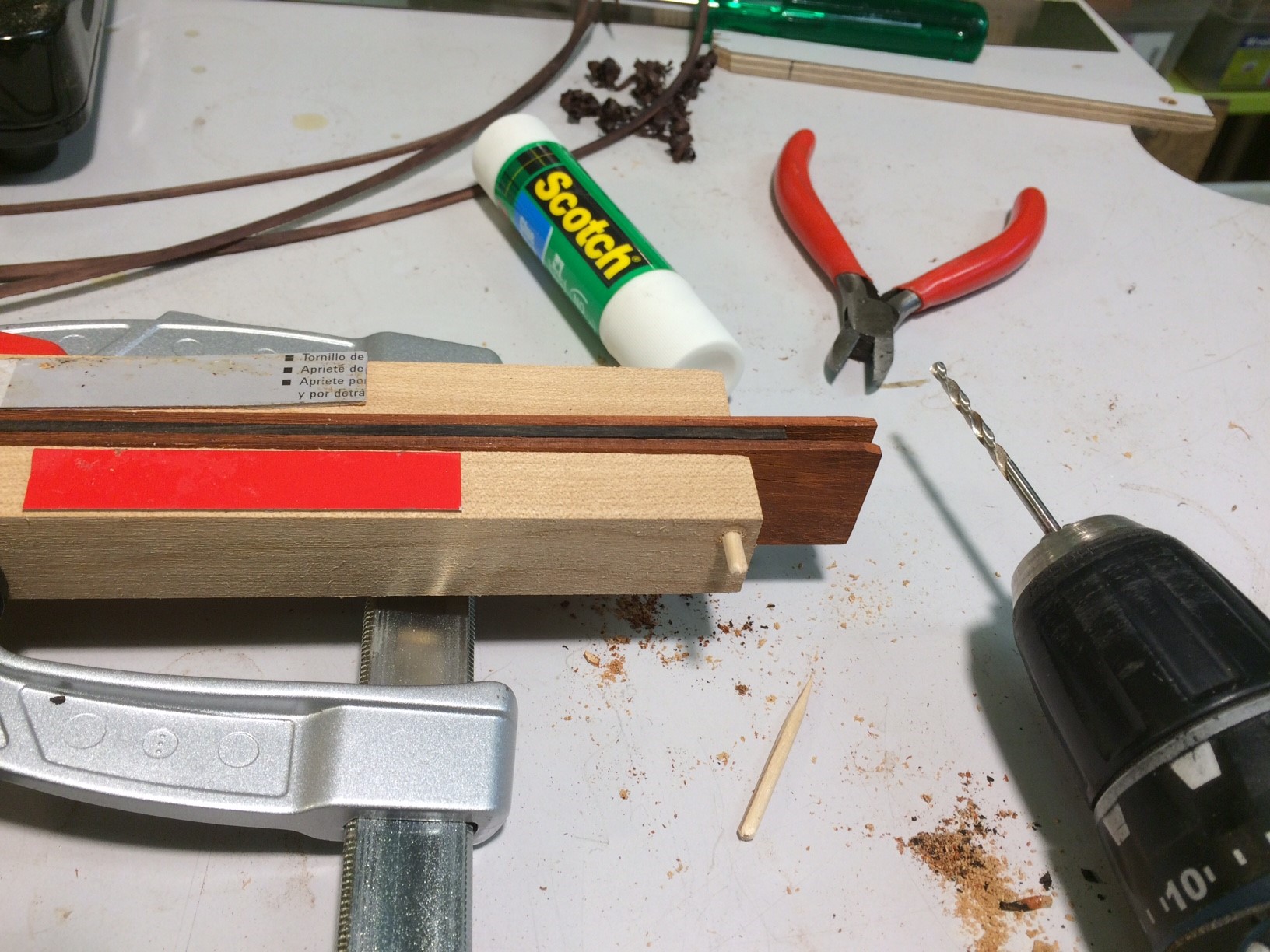 Αφού ετοίμασα τα κομμάτια του (κερασιά παντούκ και έβενο) τα ένωσα μεταξύ τους χωρίς κόλα (dry fit) και τους έκανα δύο τρύπες -μια σε κάθε άκρη- που χρησιμεύουν σαν οδηγοί για να περάσει από μέσα ένα κομματάκι από σουβλάκι (ή τέλος πάντων καλαμάκι άντε να μην επεκταθώ τώρα {celebrate010}) Αυτό το στρογγυλό ξυλάκι λοιπόν κρατάει τα κομμάτια στη θέση τους για να μην ολισθήσουν από την πίεση των σφιγκτήρων όσο η κόλλα είναι ρευστή.