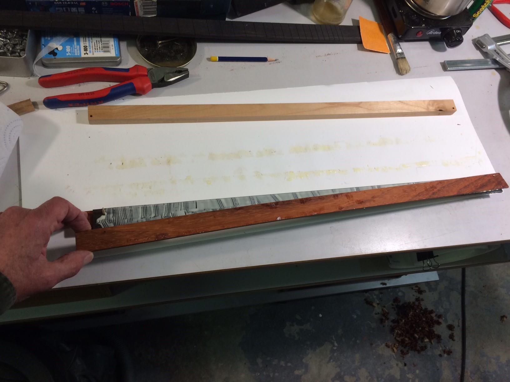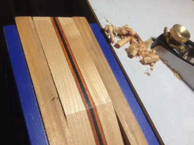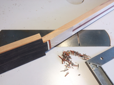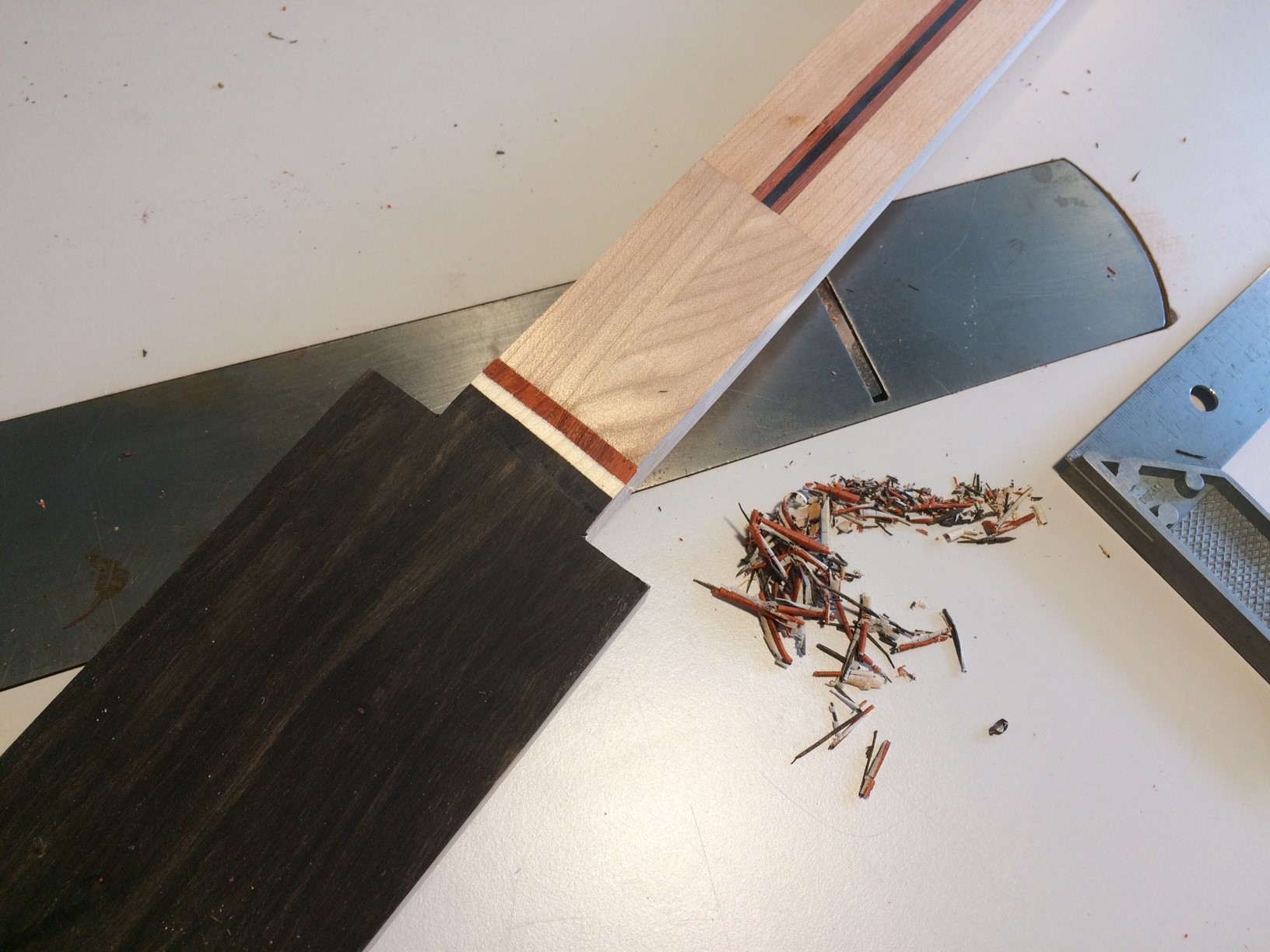 Οι καπλαμάδες ήρθαν πρόσωπο με την επιφάνεια του μάνικου πλανίζοντας το κομμάτι στον πάγκο με την ανάποδη χειροπλάνη που φτιάχτηκε για τις ντούγιες. (Η κατασκευή εδωhttp://www.luthier.gr/index.php?topic=3483.0) Πρέπει να πω οτι την αρχική ιδέα την πήρα απο τον Δημήτρη Ανδρέου.