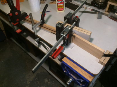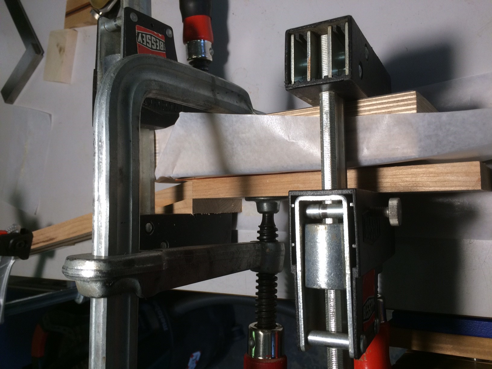 Κλειδί για την επιτυχία της πιο κρίσιμης ίσως κόλλησης του οργάνου αποδείχτηκε για μένα η σωστή προετοιμασία. Δηλαδή προσεκτικό στήσιμο με τάκους για οδηγούς και για κόντρες καθώς και με όλους τους απαραίτητους σφικτήρες (dry fit). Έβαλα λαδόκολλα στις πλευρές όπου θα ξερνούσε η κόλλα για ν΄αποφύγω ανεπιθύμητες κολλήσεις και έντυσα με σελοτέιπ τον μικρό τάκο για τον ίδιο λόγο. Κατ’ αυτό τον τρόπο δεν με απασχόλησε άλλο από τη γρήγορη εφαρμογή αμέσως μετά το άλειμμα της κόλλας. Είμαι πλέον πεπεισμένος ότι κάθε περιττή καθυστέρηση επηρεάζει αρνητικά την ποιότητα της κόλλησης. Φρόντισα ακόμη να έχω κοντά μου πινελάκι για το στρώσιμο της κόλλας και χαρτί κουζίνας. Στην ουσία δηλαδή δεν έκανα άλλο από το να αντιγράψω ό,τι έχω δει να κυκλοφορεί στο internet.