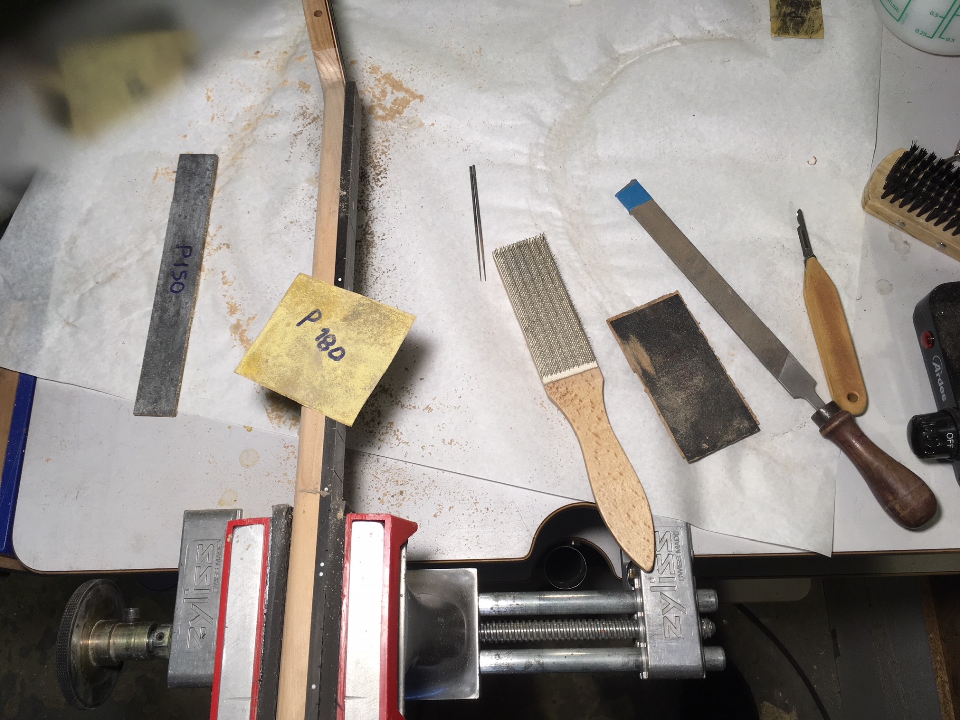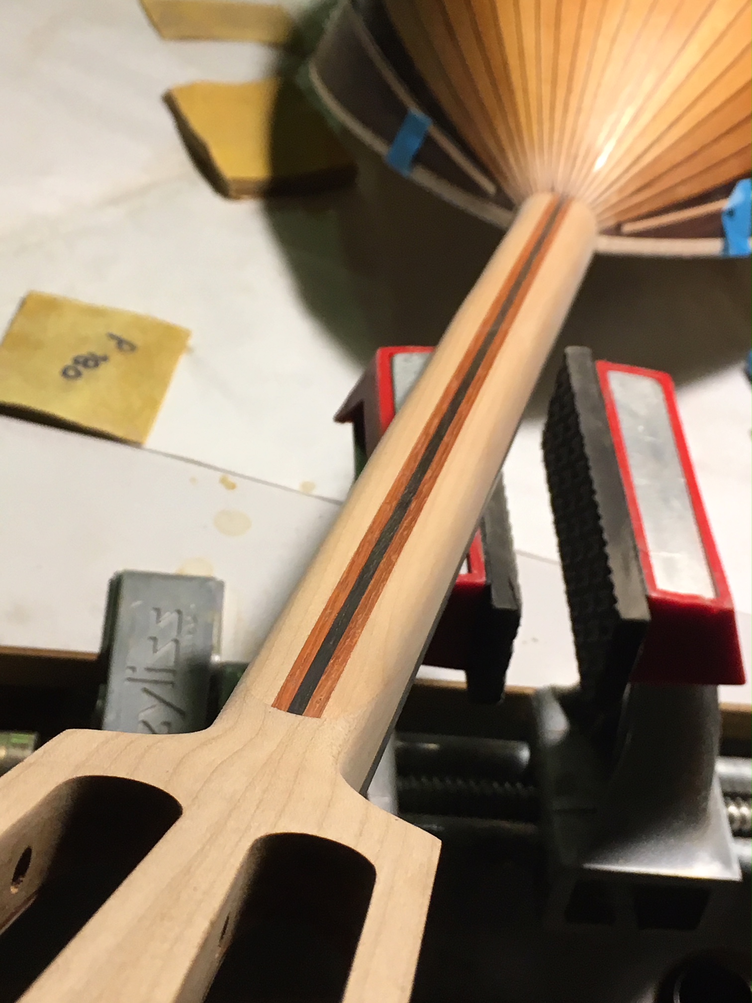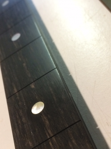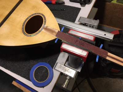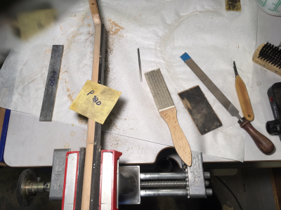 "Έσκαψα" λοιπόν προσεκτικά την καμπύλη του ρελιέφ με γυαλόχαρτο στο μάνικο ΠΡΙΝ ΝΑ ΚΟΛΛΗΘΕΙ Η ΤΑΣΤΙΕΡΑ, ποντάροντας στο ότι ο έβενος θα εξαναγκαστεί να "πάρει" την καμπύλη όταν πρεσαριστεί πάνω στην καμπυλωμένη επιφάνεια του μάνικου για να κολλήσει. Αυτό και συνέβη σε γενικές γραμμές μόνο που χρειάστηκε ξανά στρώσιμο της ταστιέρας μετά την κόλληση επειδή εμφανίστηκε μια ελάχιστη "καμπούρα" στην περιοχή 3ο με 6ο τάστο –δεν ξέρω γιατί). Τέλος καλό όλα καλά, μόνο που χρειάστηκε φινίρισμα όλη η ταστιέρα απ' την αρχή.