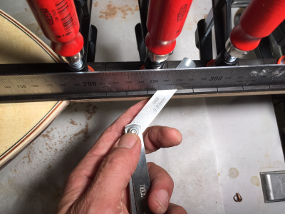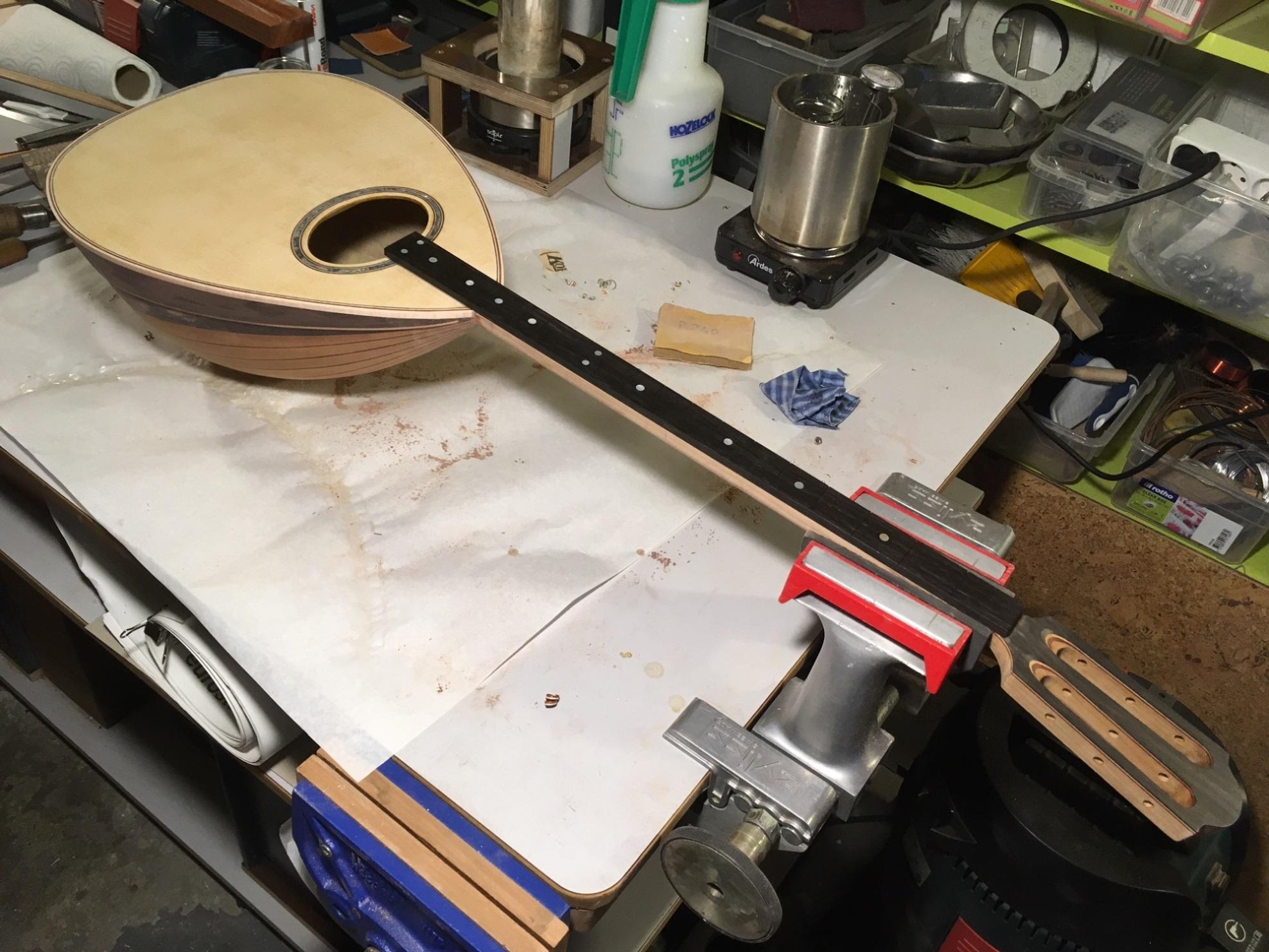 Η κόλληση της ταστιέρας έγινε (και αυτή) με hide glue και προθέρμανση των μερών. Οι συμπαθέστατες καβίλιες αν τις θυμάστε (Απάντηση #114 http://www.luthier.gr/index.php?topic=3576.105) έπαιξαν αθόρυβα και αποτελεσματικά τον τελευταίο ρόλο τους βοηθώντας την κόλληση να γίνει με ακρίβεια και χωρίς καμία καθυστέρηση επιβαρυντική για τη θερμοκρασία της κόλλησης.