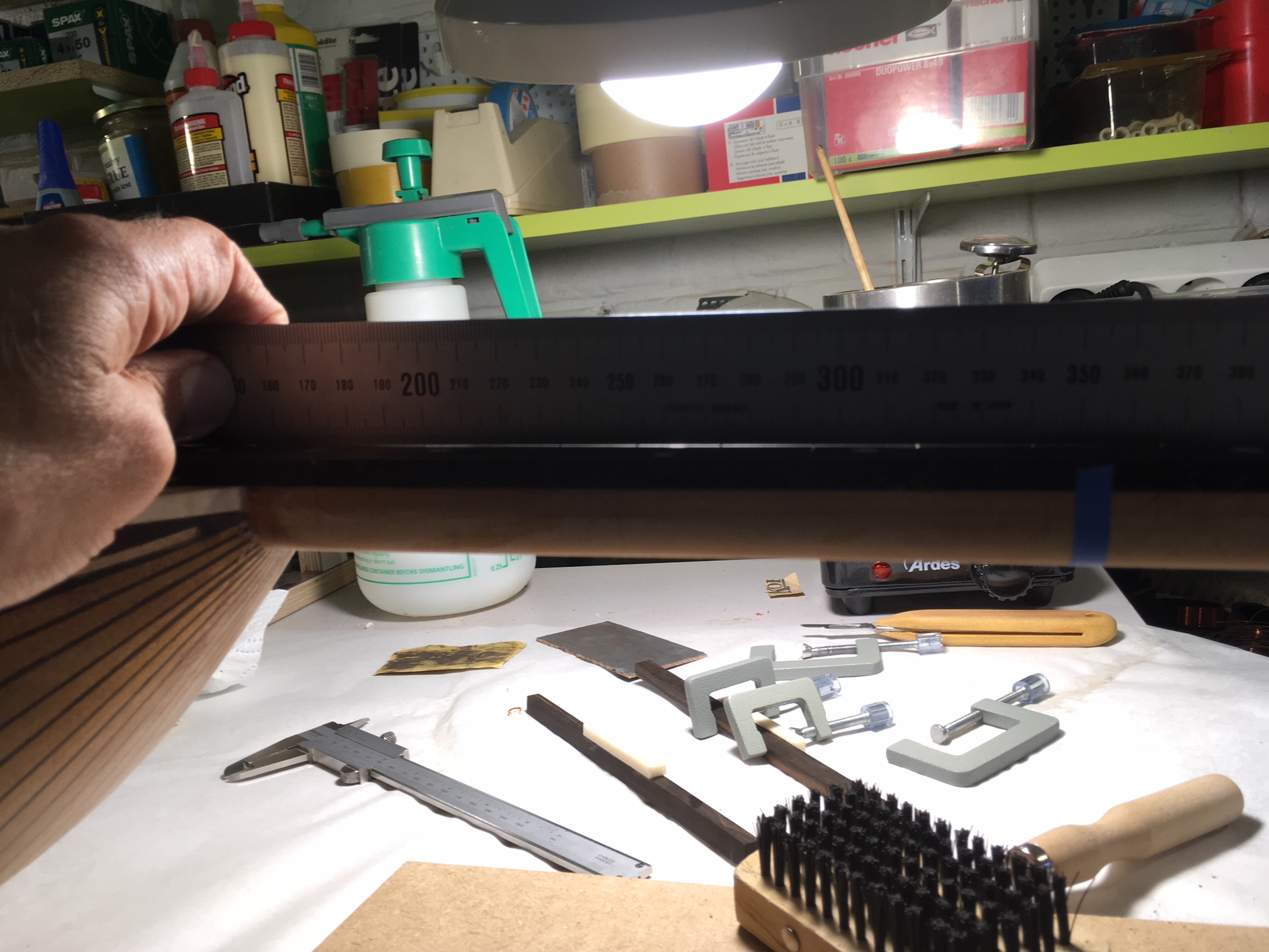 Οι πακτώσεις των καμαριών περιορίζουν τις ελευθερίες δόνησης του καπακιού και θα ήταν επιθυμητό να μειωθούν - Δεν θα είμαι τόσο ευγενικός όσο οι προηγούμενοι. Όχι απλά θέλει πάκτωμα αλλά και πατούρα για να συντονίζει καλύτερα το καπάκι με το σκάφος να έχεις διάρκεια και φυσικά ασφάλεια. Όσο για τα 4,2 κιλά κάνε το επί 10 και είσαι περίπου μέσα. Στα όργανα αυτής της οικογένειας γενικότερα έχει αποδειχτεί ότι το "παραδοσιακό" καμάρωμα δίνει το ηχόχρωμα που αρμόζει για να μην "κιθαρίζει" ή βγει κουδούνα το όργανο. Δεν περιορίζει καθόλου την δόνηση από το τελευταίο καμάρι και πάνω απλά την αφήνει όσο πρέπει. Το δικό σου καμάρωμα το περιορίζει εδικά στην περιοχή του καβαλάρη γιατί πέφτεις πάνω όπως φαίνεται τουλάχιστο στην φώτο. Το μόνο σίγουρο είναι ότι δεν θα βγάλει καλύτερο ήχο. Δεν θέλω να σε στεναχωρήσω φίλε μου αλλά αυτά τα πειράματα μέχρι και καμάρωμα μπουζουκιού σαν κιθάρα έχουν αποτύχει παταγωδώς πολλά χρόνια πριν. Απλά στεναχωριέμαι γιατί έκανες τόσο καλή δουλειά και δεν θα πάρεις αυτό που θα έβγαζε το όργανο.
