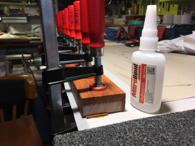 Στην επόμενη φάση και μετά από τη σχετική προεργασία, τα δυο κουρμπαρισμένα κομμάτια σφενταμιού για το binding κολλήθηκαν ζεστά-ζεστά με ζωική κόλλα (hide glue) σε δυό μονοκόμματες φάσεις, μια για τη σοφράνο και μια για τη σταβέντο μεριά.