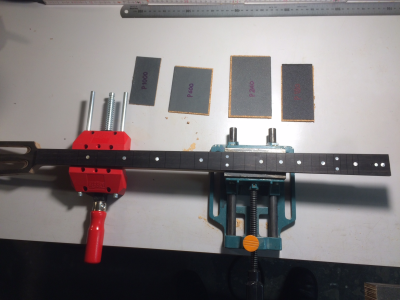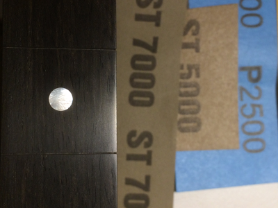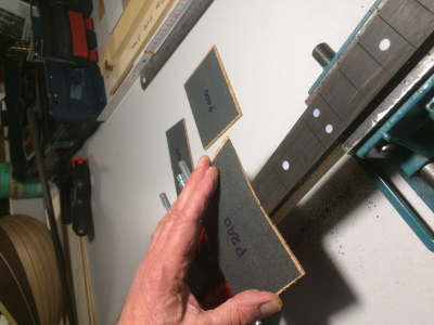 Η επιφάνεια της εβένινης ταστιέρας με τα ένθετα όστρακα φινιρίστηκε λοιπόν με γυαλόχαρτα 180, 240, 600, 1000, 1500, 2500, 5000 & 7000.  Τα δυο τελευταία νούμερα ήταν πιο πολύ για το γυάλισμα των όστρακων. Η όψη της τελειωμένης επιφάνειας είναι πλέον σατινέ και η αφή της είναι εθιστικά απαλή. "Προσκαλεί" τα δάχτυλα να την πασπατεύουν όλη την ώρα και… αυτό αρέσει. Υπηρετεί μια προσέγγιση για το setup του οργάνου που ίσως αναπτυχθεί περισσότερο όταν έρθει η ώρα.
