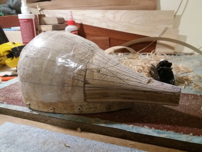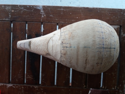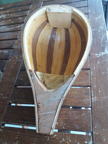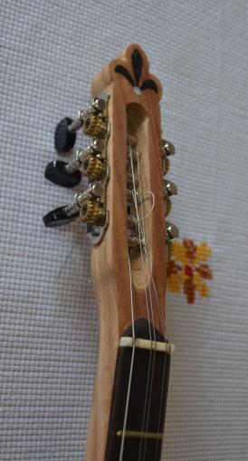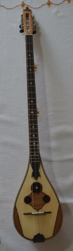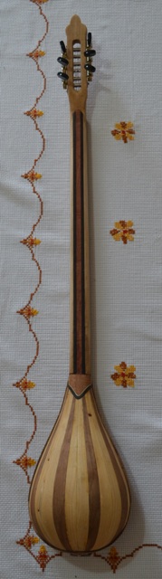 Σκαφος καρυδια-κυπαρισσι, βγαλμενο απο ενα καλουπι για μεγαλο μπαγλαμα, τροποποιημενο σε σχημα σταγονας. Καπακι ελατο με 3 ροζετες και στολισμα απο καπλαμα κερασια. Μπρατσο φλαμουρι με κοντρες βεγκε και μια λεπτουλα ευκαλυπτο για το χρωμα, οπλισμενο με υαλονηματα και εποξικη ρητινη. Καραολο φλαμουρι με καπλαμα κερασια. Ταστιερα βεγκε.