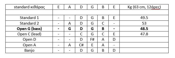 Συγκέντρωσα κάπως εποπτικά τις πληροφορίες αυτές στον παρακάτω πίνακα, υπολογίζοντας επίσης τις τάσεις που αναλογούν (σε κάποια από τα κουρδίσματα, για κλίμακα 63 εκ. με 12άρες χορδές).