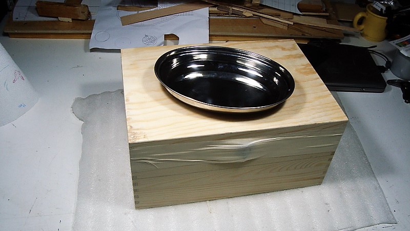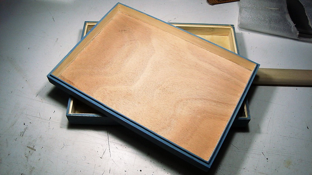 Προέλευσης Κίνας, διαστάσεων 34x24x16 εκ., φτιαγμένο από ξύλο Παουλόβνιας (καπάκι - πλαϊνά) και κόντρα πλακέ (ο πάτος). Από το ίδιο κουτί έβγαζα δύο «σκάφη» για cigar box κι έτσι αποφάσισα να κάνω ένα τρίχορδο - κι ένα τετράχορδο resonator. Για το δεύτερο χρησιμοποίησα ένα ωραίο οβάλ πιατάκι (2,5 ευρώ) που βρήκα στο Praktiker (ξέρετε, ο μουρλός που κοπανάει καπάκια από κάδους απορριμμάτων - μεταλλικά πιατάκια - και πιατάκια σκύλων - στους διαδρόμους του πολυκαταστήματος για να ακούσει αν κουδουνίζουν).