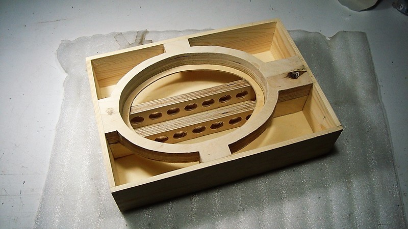 Γι αυτό το όργανο χρησιμοποίησα το υπόλοιπο του αρχικού κουτιού, περίπου 8 εκ. βάθος σε δυο κομμάτια - αποφάσισα να το αφήσω έτσι με μεντεσέδες και λειτουργικό, να ανοιγοκλείνει δηλαδή. Αυτό τελικά είναι πολύ πρακτικό, και αφού θα είχε μαγνήτη δεν μ' ενδιέφερε να είναι απολύτως συμπαγές κτλ.