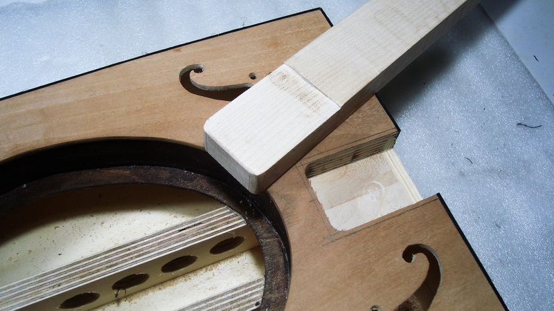- η κλίση δόθηκε στο μπράτσο με ρούτερ, από την ένωση κι επάνω προς το headstock. Έτσι στην ένωση έχει πάχος ~ 20 χιλ. (όσο και μέσα στο κουτί) και στο headstock ~ 15 χιλ. Το headstock δεν είναι ξεχωριστό κομμάτι, αλλά το ίδιο το μπράτσο που το κατέβασα (στα 9 χιλ.) με το ρούτερ.