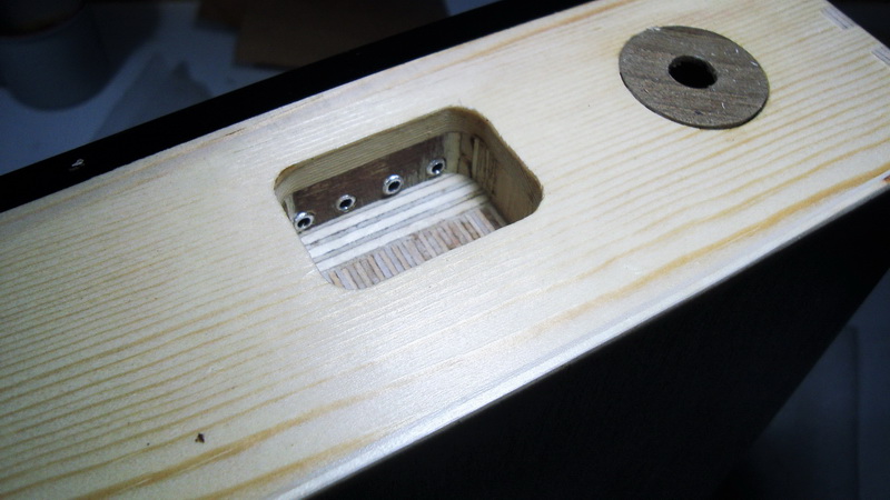 Μετά το πρώτο σετάρισμα επιβεβαίωσα ότι έπρεπε να κάνω την Break angle κάπως πιο απότομη - γι αυτό είχα "πρόχειρο" χορδοκράτη. Για να αλλάξει η γωνία έφερα πιο κοντά στον καβαλάρη τις στηρίξεις των χορδών. Αυτό έγινε περνώντας τις μέσα από το σκάφος, γνωστή πρακτική στις ηλεκτρικές κιθάρες. Δεν θυμάμαι πως λέγονται τα ειδικά κομμάτια οπλισμού των οπών, εγώ χρησιμοποίησα περτσίνια.
