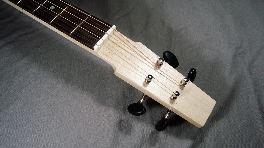 Τα αναφέρω επειδή λόγω αυτού του περίεργου - σχεδόν συνεπίπεδου και παράλληλου στην ταστιέρα - headstock, οι χορδές από το nut προς τα κλειδιά δεν έχουν αρκετή κλίση και συνήθως βάζουν κάποιο "βοήθημα" (απλές βίδες ή string trees όπως στις ηλεκτρικές) για να μπορούν οι χορδές να σταθούν. Τα συγκεκριμένα κλειδιά έχουν δυο τρύπες στους άξονες και περνωντας την χορδή από την κάτω τρύπα (εξ ου και το πάχος του headstock στα 9 χιλ.) η χορδή στέκεται χωρίς άλλη βοήθεια.
