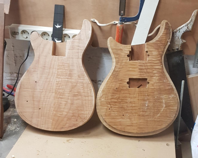 Εν αναμονή κατασκευής jigs για την νέα κλασσική κιθάρα που θέλω να φτιάξω με υπερυψωμένη ταστιερα και να μαζέψω όλα τα υλικά μου βρήκαν δουλειά να απασχολούνται μέχρι να τα ετοιμάσω. Εξηγούμαι. Όταν ήμουν 22 χρόνων πριν 13 Χρόνια είχα τρέλα με τις ηλεκτρικές. Και αποπειράθηκα να φτιάξω μια prs..Με παταγώδη αποτυχία Γτ Ούτε χώρο είχα Ούτε εργαλεία κατάλληλα.. Οπότε έμεινε...στην αρχή.. τα ξύλα ήταν παρατημένα στο υπόγειο του πατρικού και αγνοούνταν  η τύχη τους..τα βρήκε ο πατέρας μου χθες και μου τα έφερε αν τα θέλω η να τα βάλει στο τζάκι.. σκέφτηκα να τα κόψω να βγάλω ροζετες από τον σφενδαμο  πατουρες από το Μαονι.. Η γυναίκα μου είναι της άποψης να τα τελειώσω να γίνει μια κιθάρα.. βέβαια έχω ξεχάσει διαστάσεις γωνίες και τα σχέδια τα έχω χάσει.. αν μπορούν οι ηλεκτρικοι Νάσος Θάνος να δώσουν κάποια συμβουλή να τα ξεκινήσω τουλάχιστον και ότι βγει..το δεξί σώμα είναι άχρηστο.. παρόλο που εχει ωραίο σφενδαμο δεν μπορεί να γίνει prs..είναι σφαγμενο στο αριστερό κερατο.. επισυνάπτω φωτο..