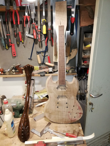 Μετά από απραξία 2 εβδομάδων χάραξα ταστιέρα. Δίπλα και  ο μπαγλαμάς με λούστρο στο σώμα (αλκυδικό). Άφησα το καπάκι για να κάνω λούστρο μπάλας (προς το παρόν έχω περάσει ένα σήλερ νίτρου) και έκανα την πρώτη μορφοποίηση σε καβαλάρηδες και κόκκαλα. Την ταστιέρα πρώτα την κολλάω στο μάνικο και μετά την χαράζω και περνάω τάστα.Θα μπει και σειρίτι λευκό περιμετρικά της ταστιέρας. Μάλλον τα κάνω λίγο ανάποδα αλλά και γω ανάποδος είμαι.
