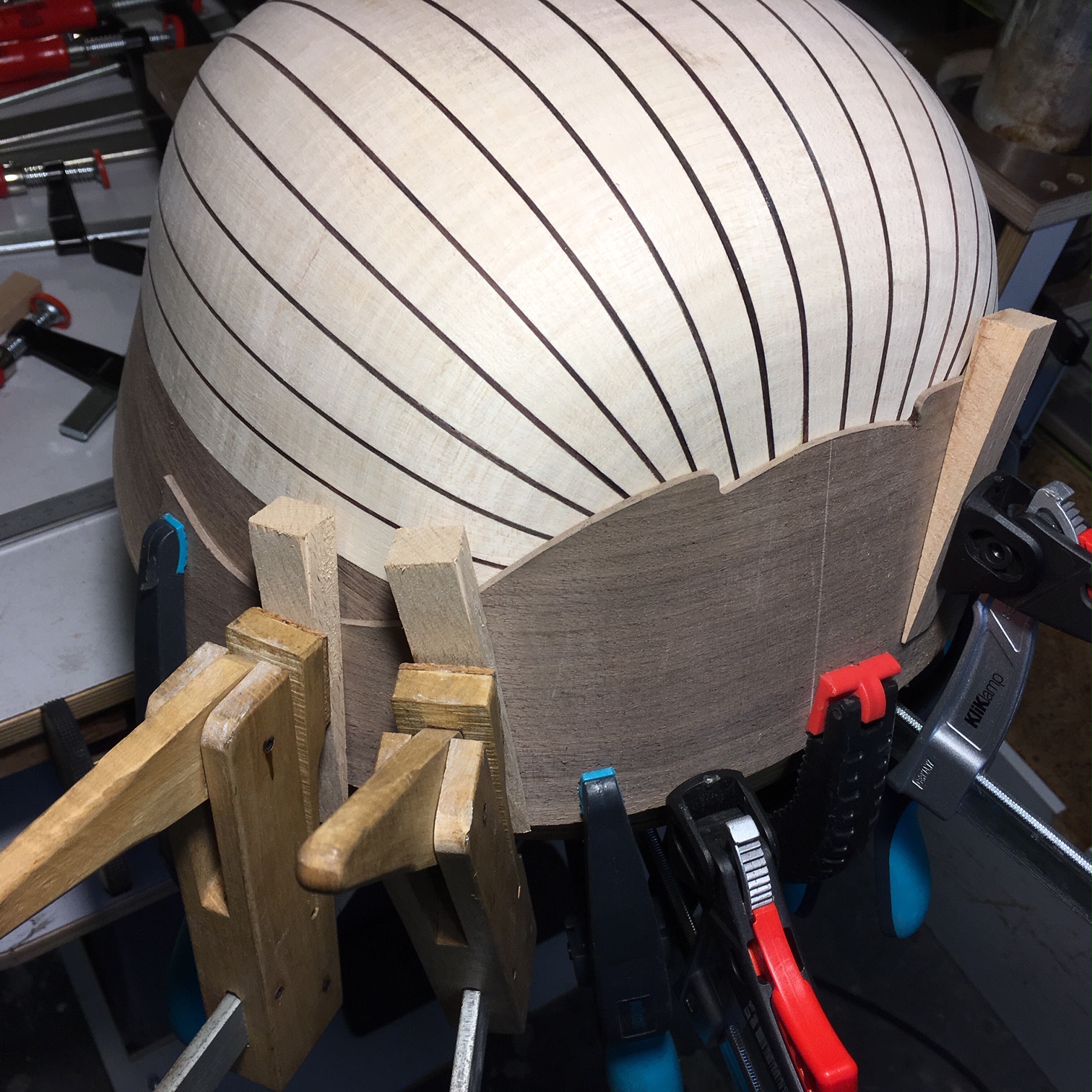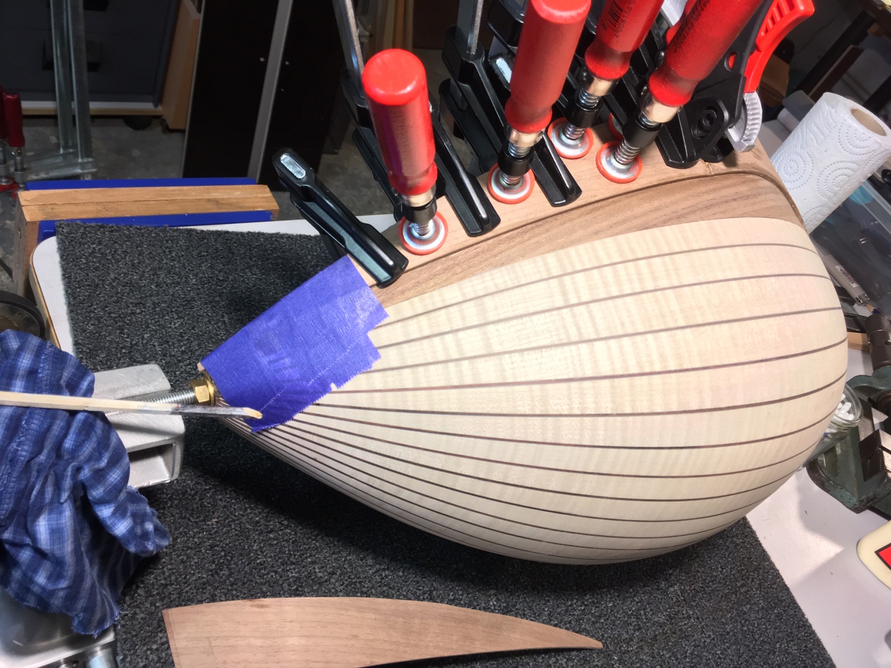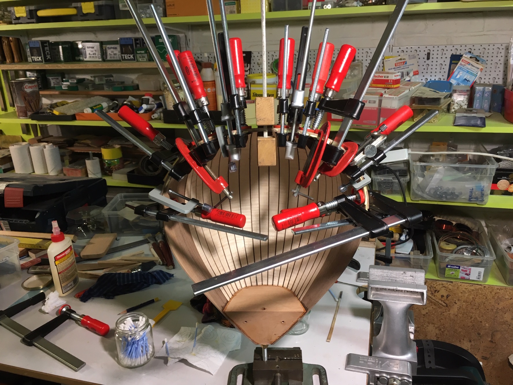 Στη 2η φωτο διακρίνεται και η ολόπασση βέργα που είναι βιδωμένη στον ξετρυπημένο τάκο. Με βοηθάει αφάνταστα στη στήριξη του σκάφους και στην κόλληση της κολάντζας εκτός καλουπιού (που όπως ίσως θυμάστε και από το 1ο μπουζούκι με είχε προβληματίσει θεωρώντας τη μια πολύ σοβαρή κόλληση που δεν επιδέχεται κενά και αμφιβολίες).
