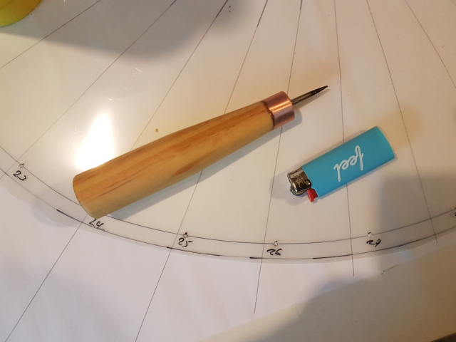 Αφού κόπηκε στο σχήμα, ανοίχτηκαν τρύπες (30) με ζεστό σουβλί.