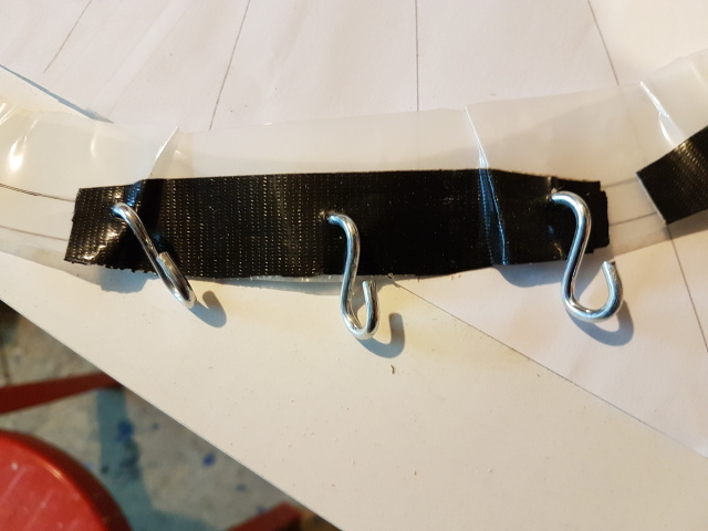 Από τις τρύπες αυτές, πέρασαν μεταλλικά άγκιστρα που στερέωναν δεματικά (tiewraps). Τα δεματικά ομαδοποιήθηκαν σε πεντάδες και τοποθετήθηκαν σε εντατήρες όπου και τέντωσαν το Mylar. Κατόπιν στερεώθηκε με καρφωτικά στο σώμα