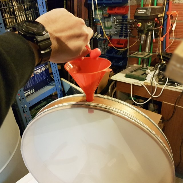 Όταν τελειώσεις, κλείνεις τη μία άκρη με πανί εμβαπτισμένο σε εποξειδική και τεντωμένο πάνω στη άκρη του σωλήνα (τζιν ή καραβόπανο είναι μια χαρά), σαν να φτιάχνεις τυμπανάκι