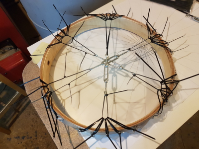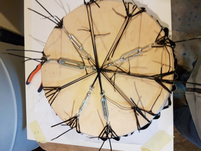 Μάνο, το μπλέξιμο με τα δεματικά δεν είναι πολύ μεγάλο. Πρώτα "μάζευα" την μία πεντάδα (ή τριάδα) στη μία άκρη του εντατήρα και μετά την αντιδιαμετρική της πεντάδα. Όλα, σαλλλονικιότικα δηλαδή χαλλαρά   {celebrate015}, και αφού συμμαζεύτηκαν όλα, τάνυση σε ένα-ένα τα δεματικά όσο πάρει με το χέρι (χωρίς πένσα). Όταν ένα ήταν πολύ πιο τεντωμένο από τα άλλα τότε έσχιζε λίγο το mylar και ερχόταν η ισορροπία από μόνη της. Παρ' όλ’ αυτά, ο συνδυασμός των δεματικών σε τριάδες με 5 εντατήρες νομίζω έκανε πιο αρμονική την τάνυση. Την άλλη φορά πάντως, έτσι θα αρχίσω και με ducktape για ενίσχυση.