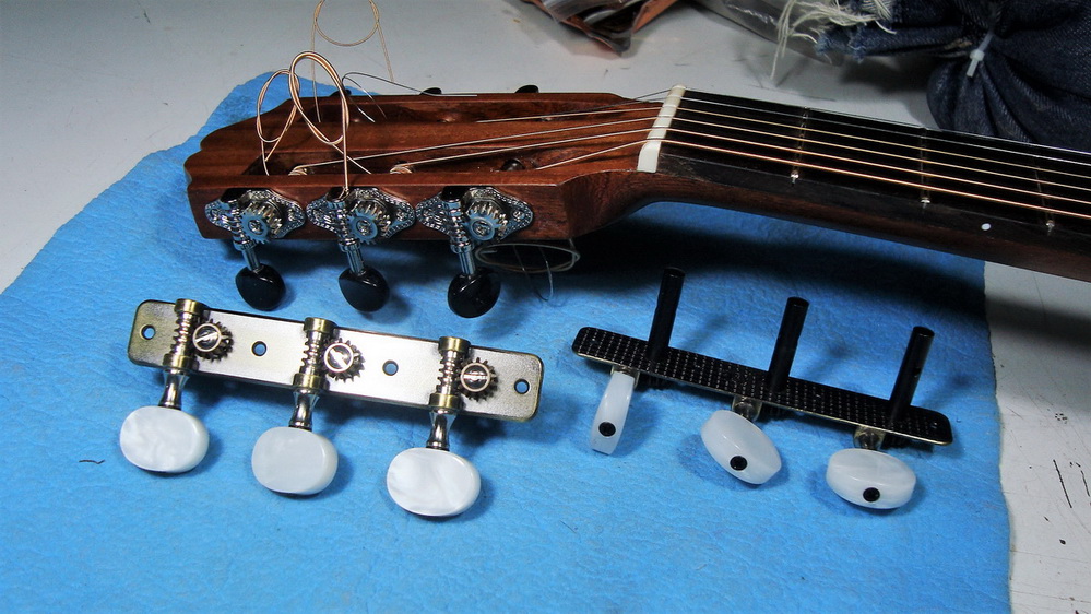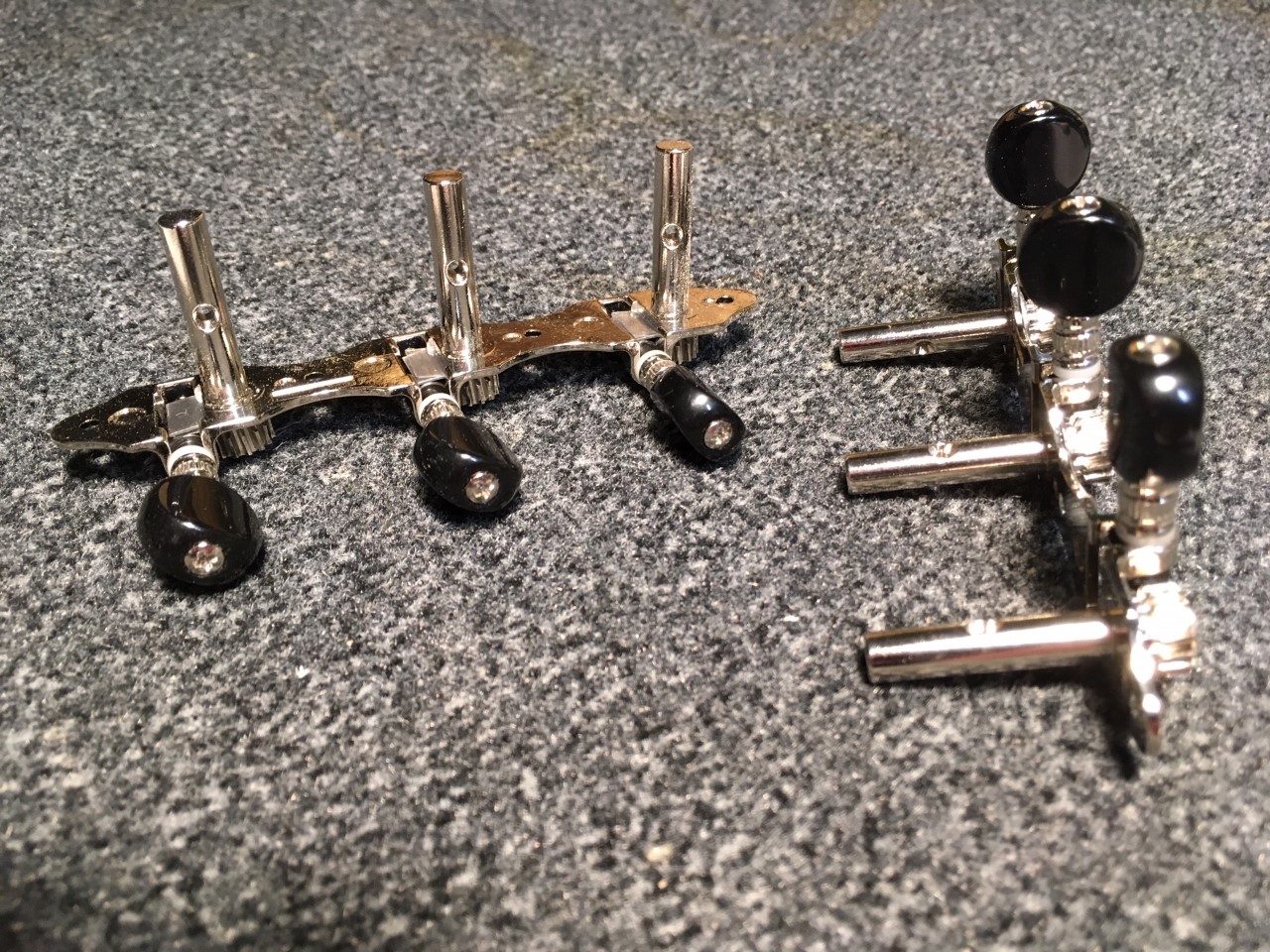 σ' αυτήν την δεύτερη φωτογραφία τα grover είναι με κούφιο αξονάκι (για μείωση βάρους, δουλεύει). Επίσης φαίνονται και τα Der Jung (κωδικός DJ403AB-P2W, αντιγράφω από το σακουλάκι, δεν βρήκα όμως τον ίδιο κωδικό στο Internet) τα οποία είναι επίσης πολύ καλά κλειδιά για κιθάρες (35 mm) αλλά με λίγο μεγάλο κουμπί για μπουζουκοειδή - και ακριβότερα (~ 25-28 ευρώ, δεν θυμάμαι καλά).