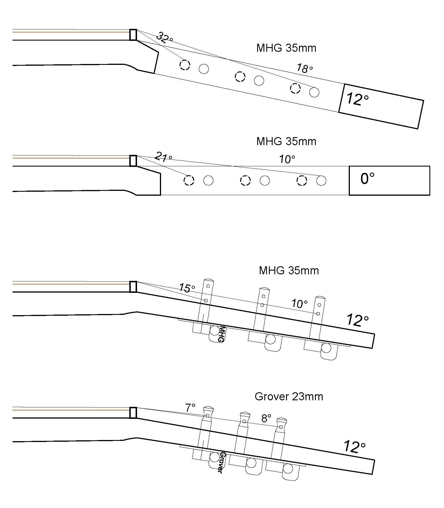 Η ίδια γωνία 12° με καράολα με σχισμές και MHG 35mm σημαίνει πολύ μεγαλύτερες γωνίες χορδών, ειδικά στις κοντινές στο κόκκαλο. Δεν ξέρω ποιά γωνία θα ήταν θεωρητικά πιο σωστή. Υπάρχουν συζητήσεις επί συζητήσεων σε ξένα site για την γωνία των χορδών αλλά δεν έχω βγάλει συμπέρασμα. Αυτό που μπορώ να σου πω είναι οτι οι χορδές της άρπας έχουν γωνία 6° αν θυμάμαι καλά και πολλοί το χρησιμοποιούν ως σημείο αναφοράς. Μετά μπλέκονται ηλεκτρικοί με κλασικούς (κιθαρίστες) και γίνεται χαμός.